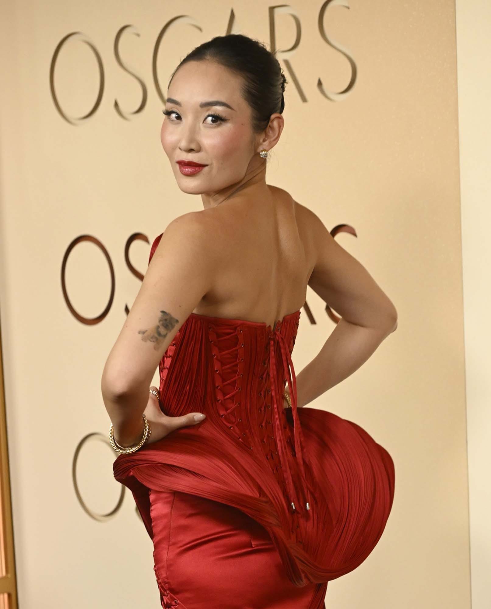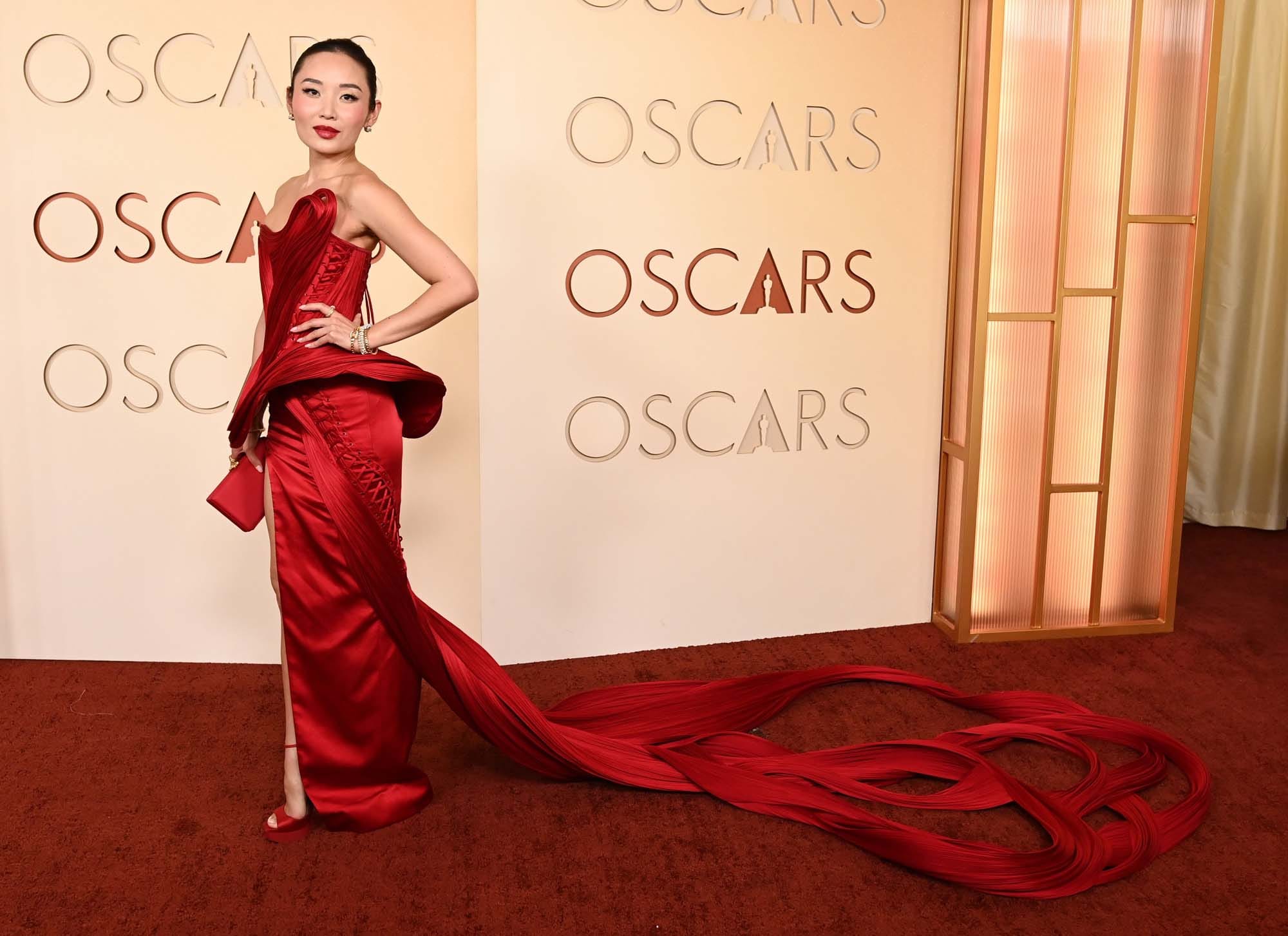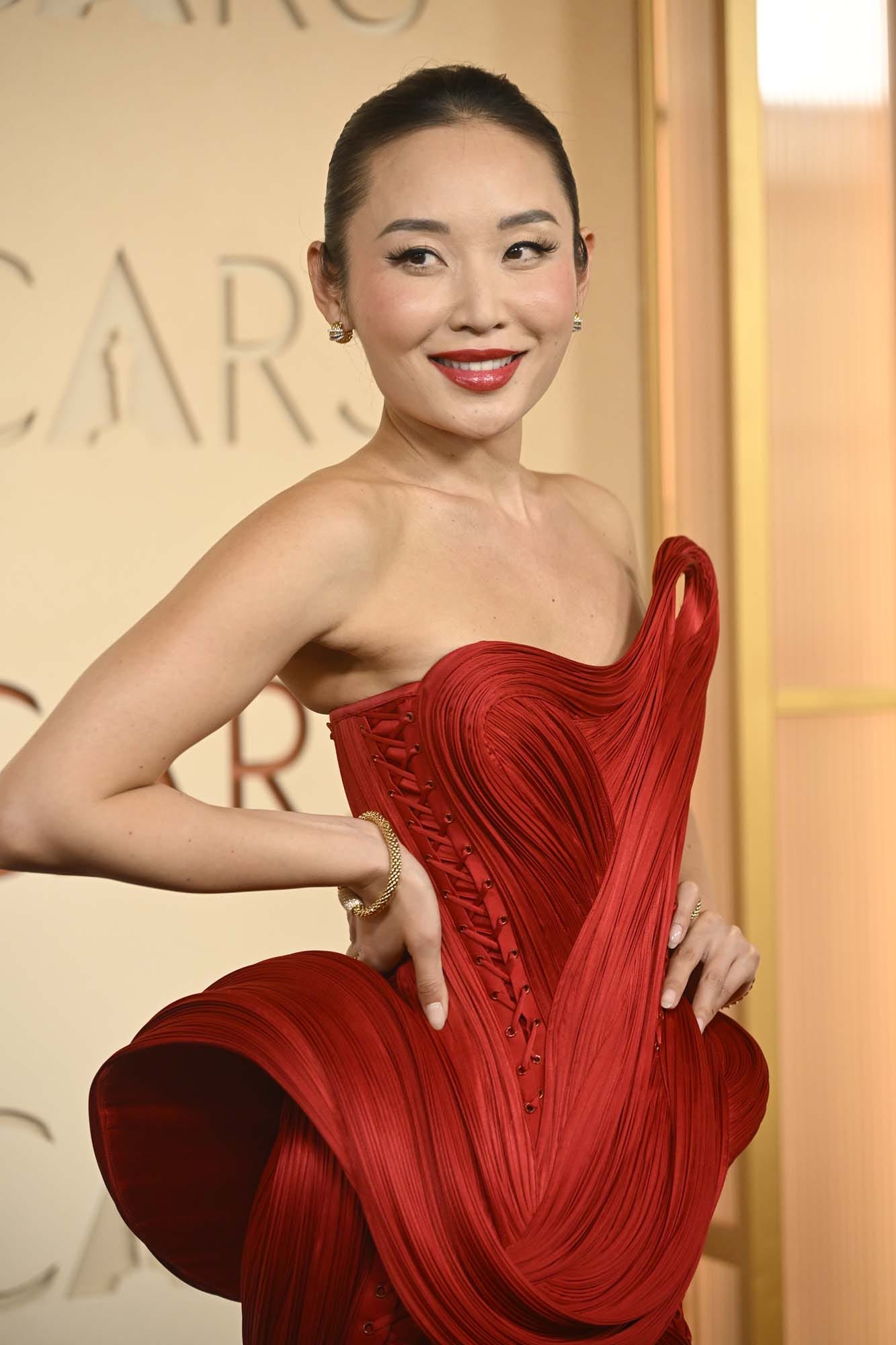 Li-Li plays a woman of Chinese descent in the film, representative of the Chinese immigrants living in the Mississippi Delta. Ryan Coogler, during the Sinners awards run, has talked about the diversity in this film. He grew up watching films and shows where even if there we few Black people, and not necessarily marketed to the Black community, he could still relate to the storytelling anyway. Now that he’s a filmmaker himself, Ryan has shared multiple times during Q&As and panel sessions that he gets why people from a variety of different backgrounds and cultures see themselves in his work. For Li-Li then, to be involved in this project, representing the Chinese diaspora, and attending the Oscars for the first time as part of the team, it had to have been profoundly meaningful, and this is reflected in her dress choice.