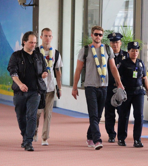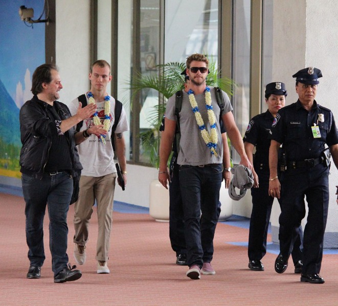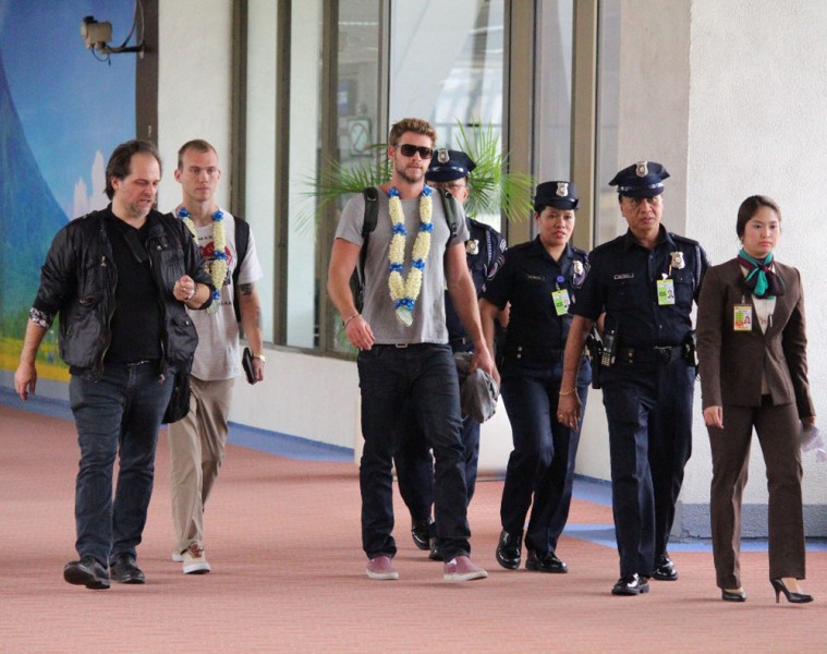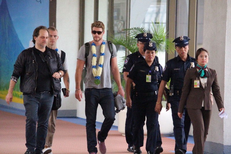 Here’s Liam Hemsworth arriving in Manila today as brand ambassador for Bench. Journalists were held to pre-selected questions and given strict instructions not to ask personal questions. It’s his first official public appearance since all the speculation started about whether or not he stepped out on Miley Cyrus with January Jones and hit on Emma Watson. As they’ve not been together in at least two weeks while he spent time with family in Australia, word is they’re done. Or taking a break. Or done but not permanently. Or not done but thinking about not being done.