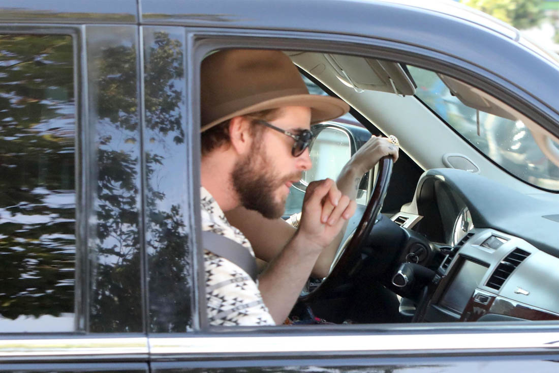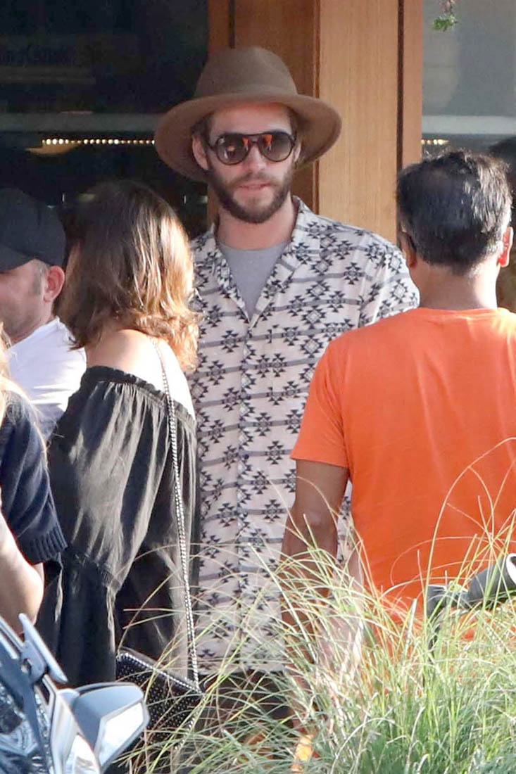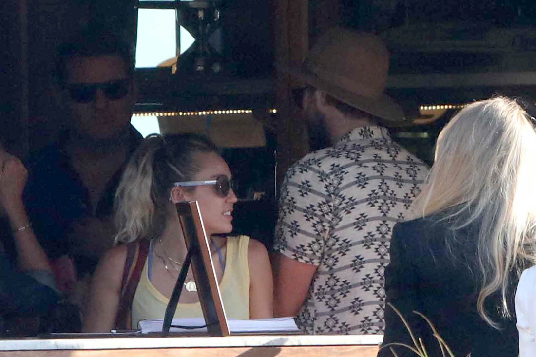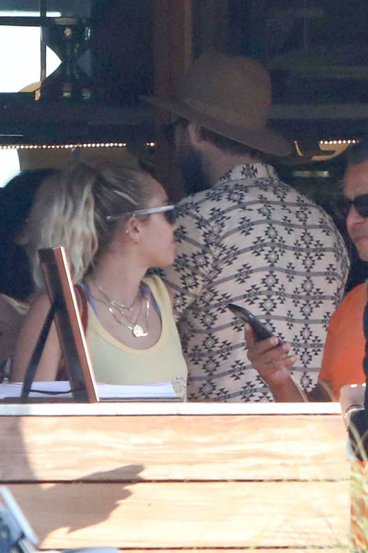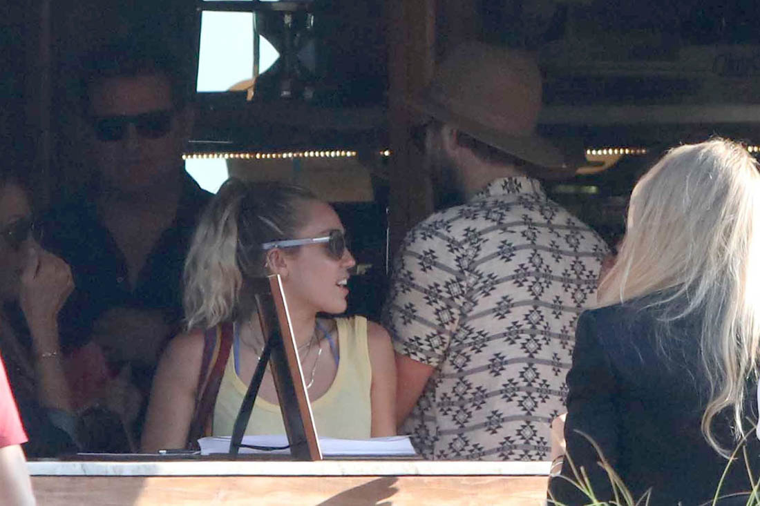 Attached - Miley and Liam having lunch with friends and family yesterday in Malibu.