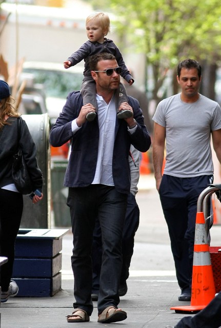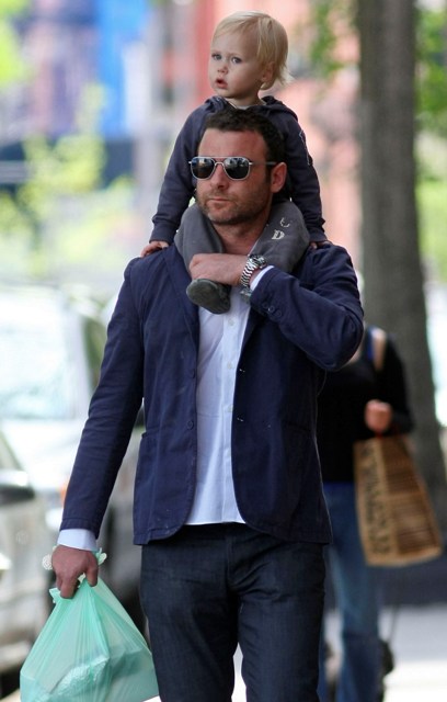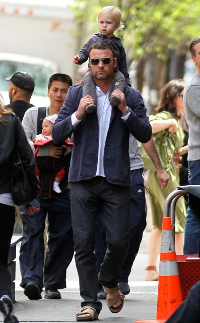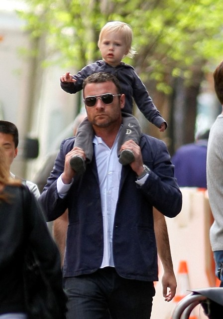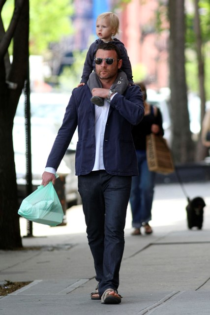 Liev Schreiber skipped the Hollywood premiere of Wolverine the other night because his son Sasha was sick in New York. Sasha was briefly hospitalised but is clearly feeling much better, enjoying time on dad’s shoulders yesterday during a walk through Soho. He is cute!