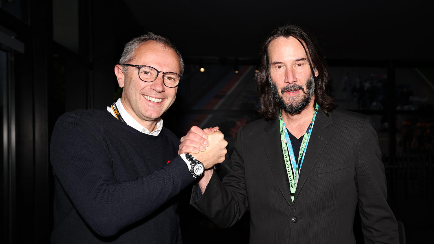 As for Keanu, he was seen initially in the Aston Martin garage – perhaps that’s the Canadian connection as the team is owned by Lawrence Stroll, a Canadian.