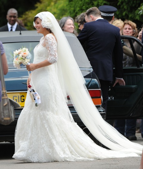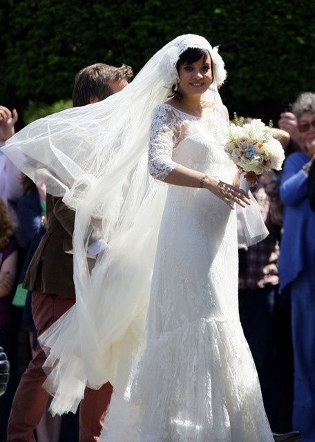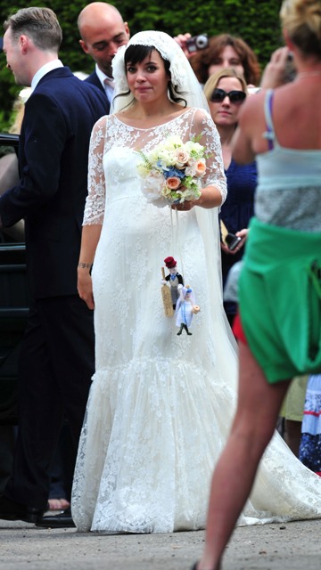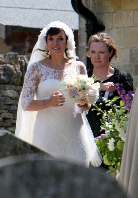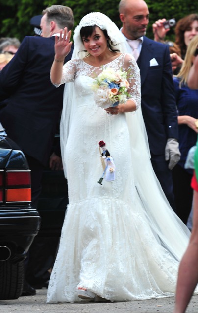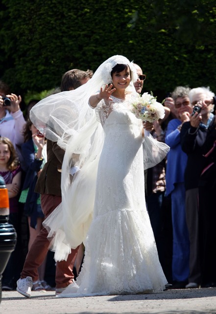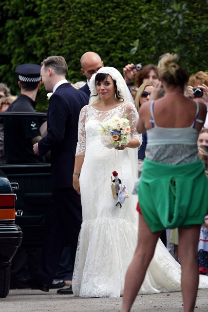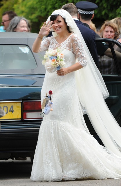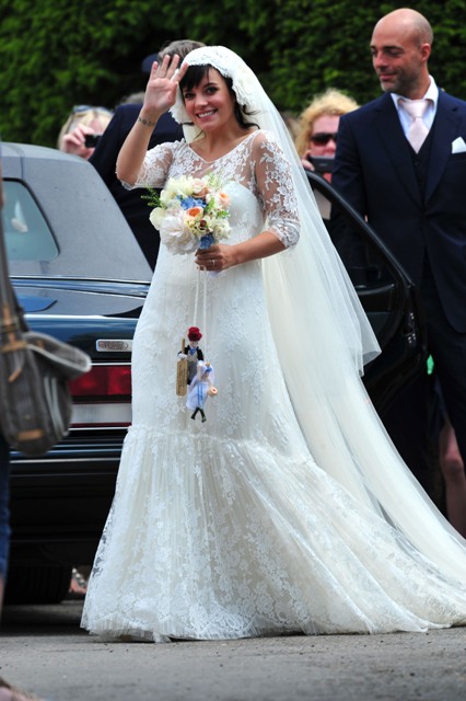 Lily Allen married Sam Cooper on Saturday. There were sleeves. There was a lot of lace. And an old fashioned headdress that, to me, was romantic and whimsical and sweet, like something from the 20s. All weddings look the same these days. Especially over here in North America. Strapless dresses and satin and such. Mine too. Lily chose something for her. It’s lovely.