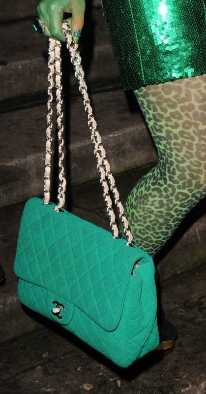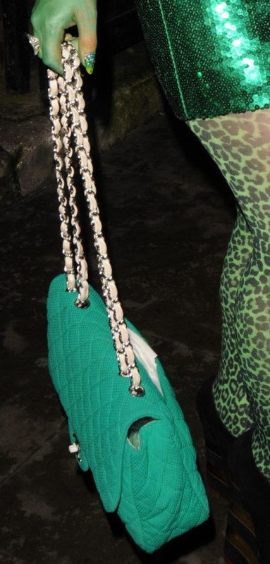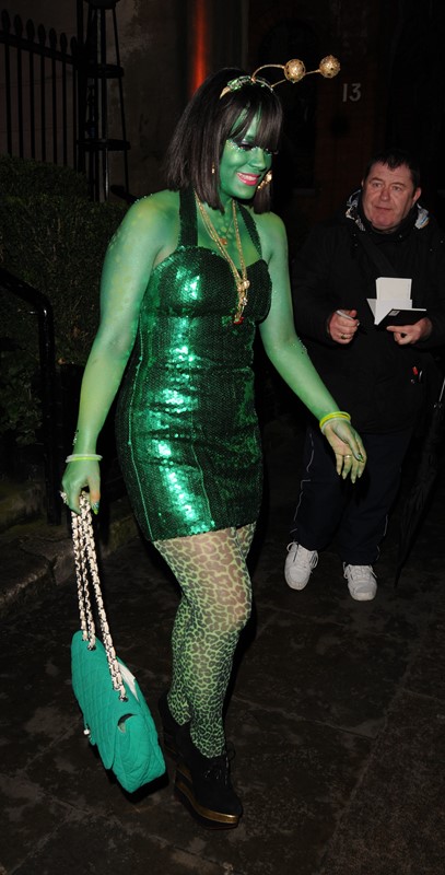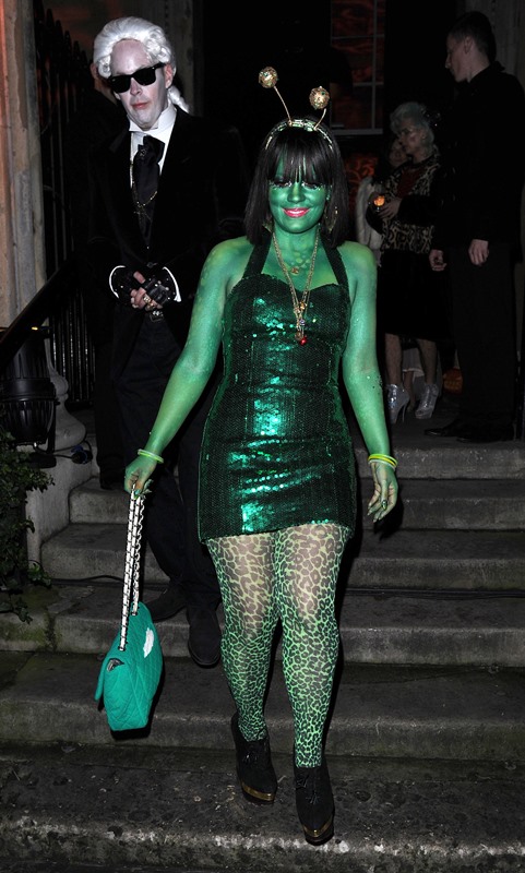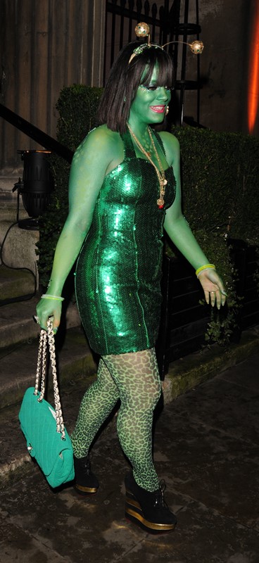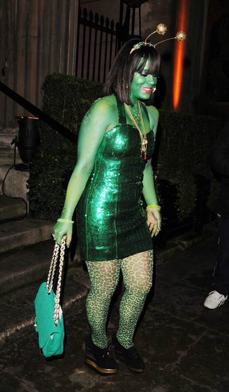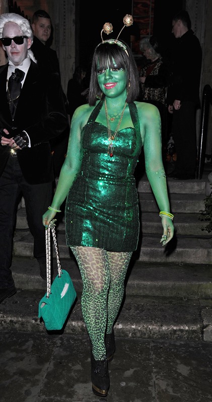 Check out Lily Allen out for Halloween last night. In a green costume with a matching green Chanel bag. Can you imagine having enough Chanel that you can find one to complement your Halloween costume?