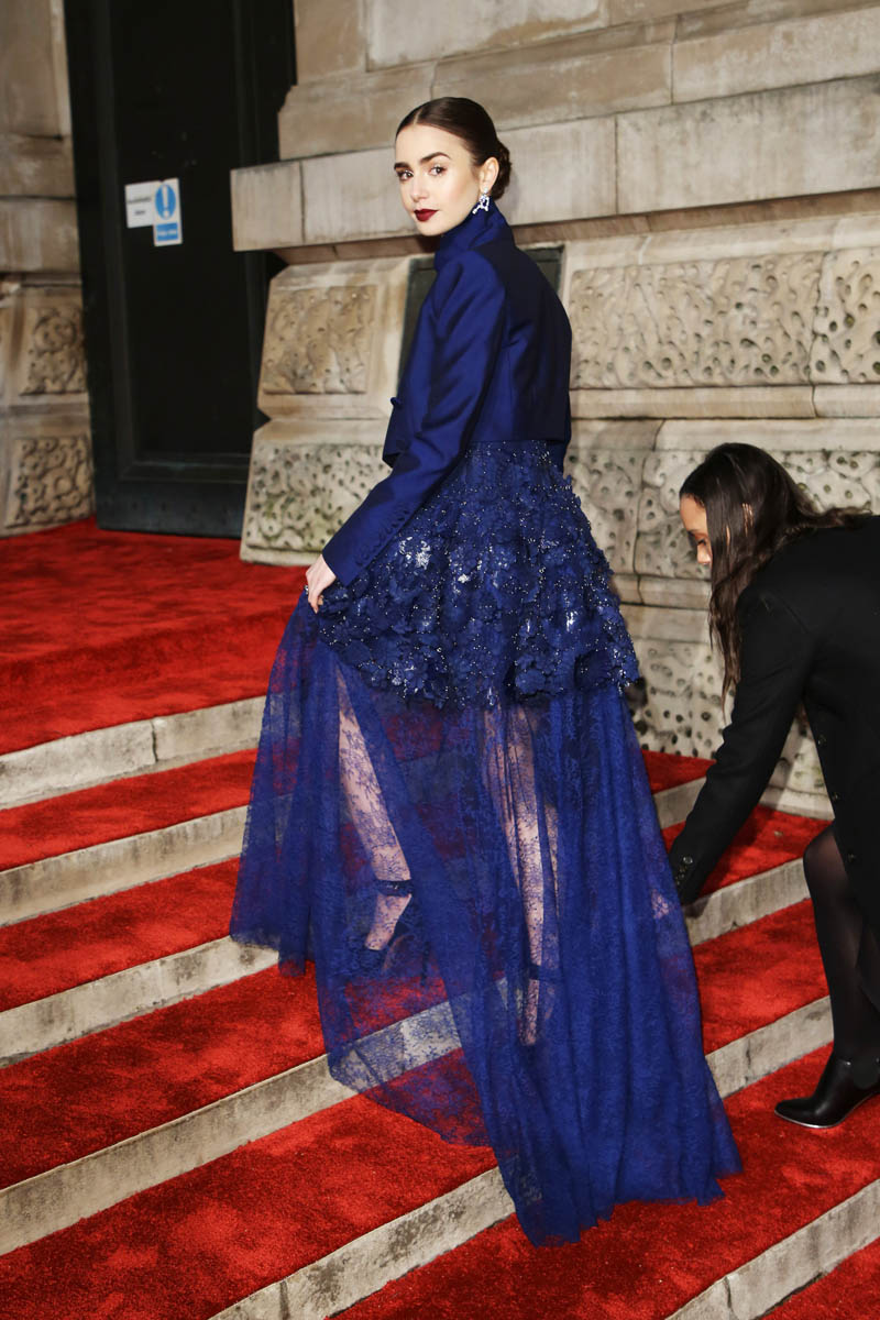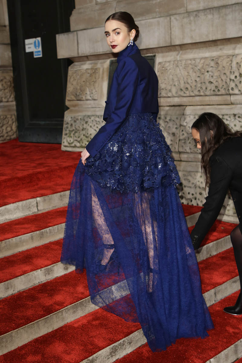 I knew it from the minute I saw her, this was the one. This look on Lily Collins could challenge any of the looks we’ve seen during award season so far. It’s exquisite. Even though navy blue is not usually my jam. Even though a sheer skirt isn’t usually my jam. But this blue and sheer is not like other garden variety generic clue sheers.