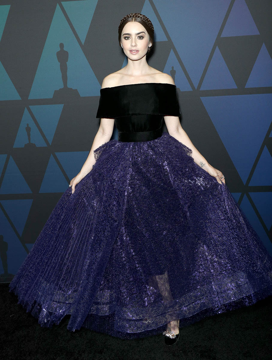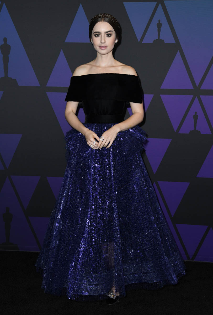 I don’t think if this outfit was on a hanger I would give it a second look. The off-the-shoulder top isn’t my thing. And the colour of the skirt isn’t either. The skirt itself though… I f-cking love the shape of this skirt. It’s regal. The whole look is regal. And Lily Collins really leans into the royal vibe of the outfit right up to the hair. Excellent hair choice here. Really Tudor. Like she could have walked straight out of a portrait in a museum.