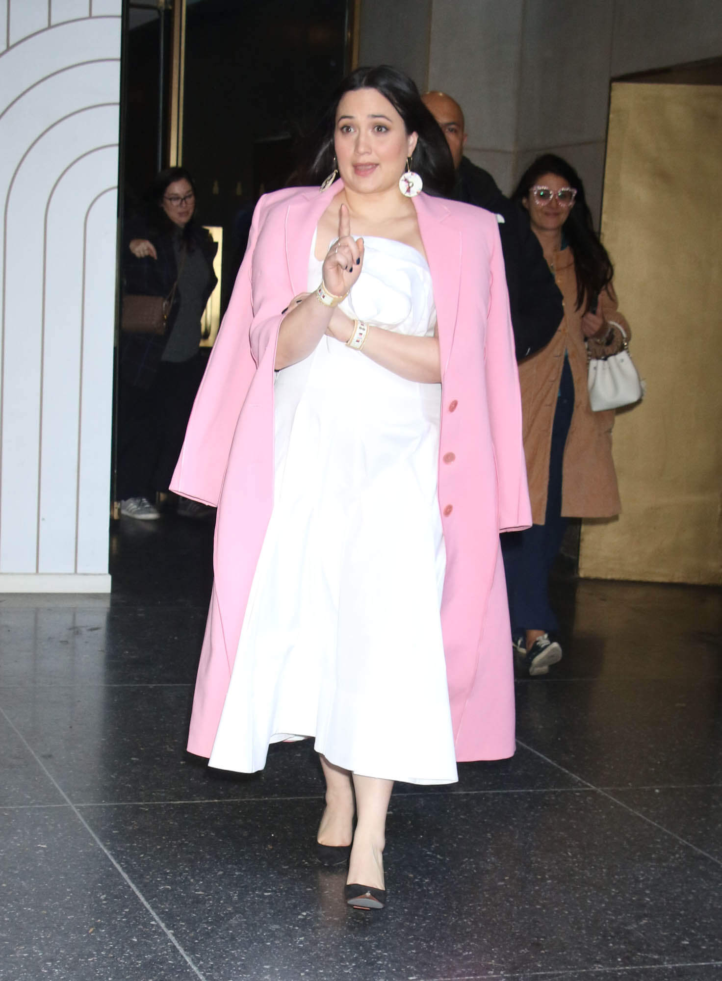 Coming out of the studio, Lily changed into a different white dress and a Barbie pink coat. It’s a nice look, and I would probably be more excited about it had she not just worn that AMAZIIIIIINNNNG yellow coat.