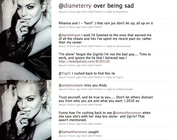 Lindsay was crack tweeting again the other night. Apparently she was “rushing” back to see Sam but then ended up accusing Sam of cheating on her. Whatever. I can’t make sense of her rambling. OF COURSE she ended up pulling down the posts quickly. But since we’re all onto her crazy, the page was cleverly screen capped for preservation.