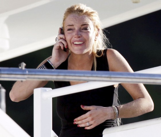 Lilo and Ali crying into their phones on the yacht after Lilo punched some dude the night before who was supposedly creeping up on her 16 year old sister. According to the paps, Lindsay warned the perp to watch himself, then when he blew her off, she threw her fist into his face. Bodyguards had to separate them and Ali was escorted back to her boat where vodka bottles can be seen lying around.