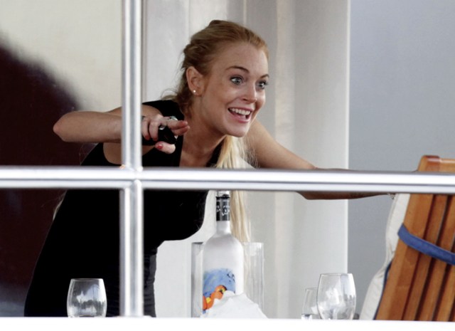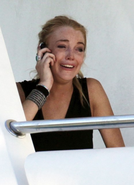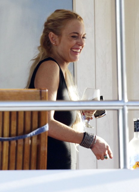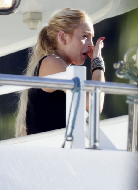 Lilo and Ali crying into their phones on the yacht after Lilo punched some dude the night before who was supposedly creeping up on her 16 year old sister. According to the paps, Lindsay warned the perp to watch himself, then when he blew her off, she threw her fist into his face. Bodyguards had to separate them and Ali was escorted back to her boat where vodka bottles can be seen lying around.