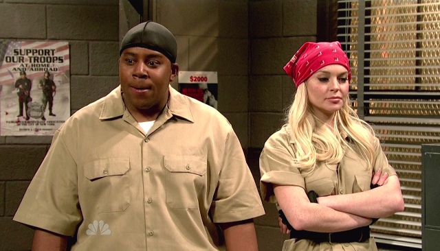 I wonder if the writers, if they just gave up this week. If they realised that it wouldn’t matter this week. That Lohan is such a spectacle, quality wouldn’t be an issue. Or...was it because she didn’t actually spend much time there, preferring instead to make the rounds on every talk show in New York, that they threw their hands up like, fine, we’ll save all our good jokes for next week...