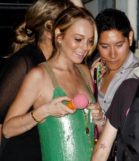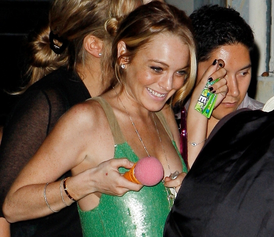 Surrounded by photographers, the two showed no compunction about holding hands, and Lilo even flirted with her honey using a faux ice cream positioned near her nipple.