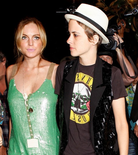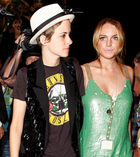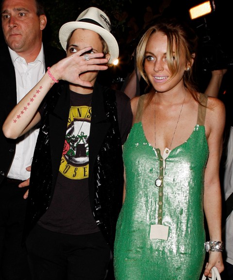 Samantha Ronson celebrated her birthday yesterday with her girlfriend Lindsay Lohan who put on her best green dress to please her lover. Sam returned the favour with a pair of tuxedo pants and sassy white hat. Yum.