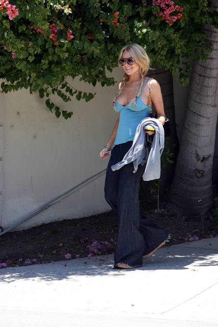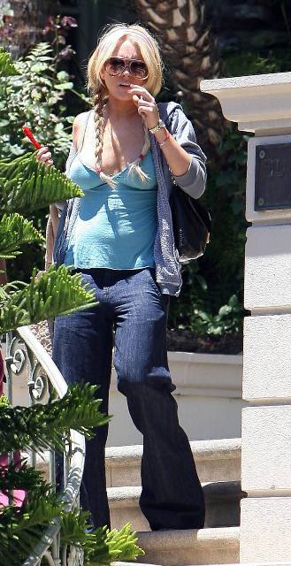 Here she is the other day looking 40 years old out and as saggy as I am (big tits suck...see?). Curiously enough though, photographers did not seem to catch her turning herself in at the Beverly Hills police station yesterday.