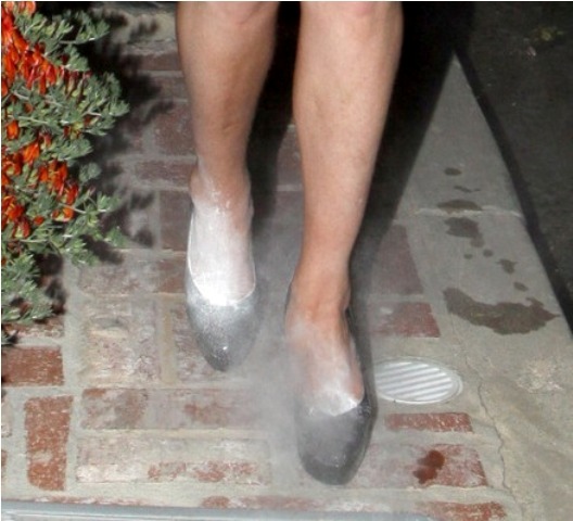 By now I'm sure you've seen these photos of a busted face Lindsay Lohan out and about in LA the other night with curious white powder floating out of her shoes. Automatic assumption would be cocaine. Obviously. I mean it's Lilo after all. However, more probably, as Michael K from Dlisted.com suggested, the substance is likely baby powder for foot odour. Or a desperate ploy more attention. Success.