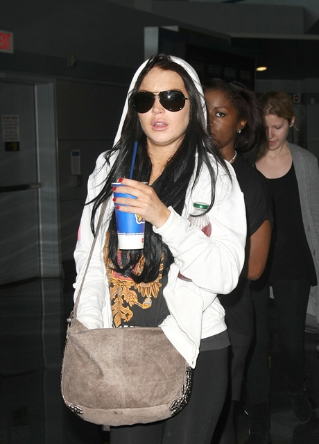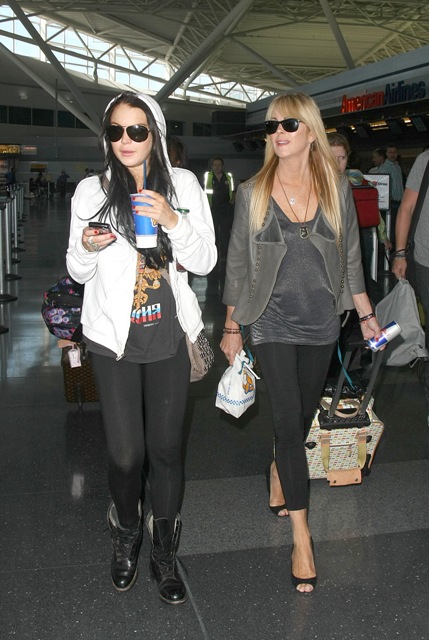 This is Lindsay Lohan arriving back in New York today with a bloated busted face. Her ma was with her too. So she can say that “mommy” knows best how to control the crank. Sure. Because mommy is sharing the goddamn crank.
