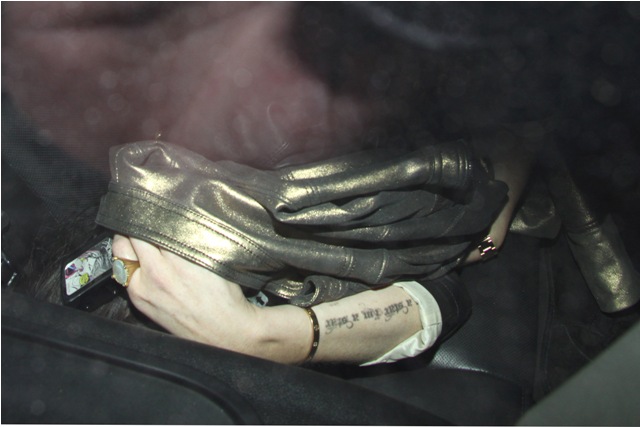 At some point in the night she also went to a drive-thru. Didn’t want to be photographed – why not??? – in the backseat. Apparently there’s a tat on her arm that reads “I’m a star I’m a star”.