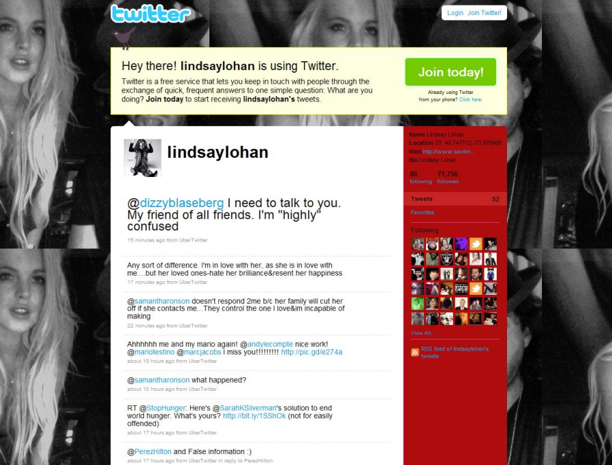 She’s lashing out again on Twitter. As recently as an hour ago (at press time). As usual, it’s because Samantha Ronson won’t call her back. Or talk to her. Or maybe she’s busy, or sleeping, but whatever the reason, Lilo is freaking out and sharing with the world: