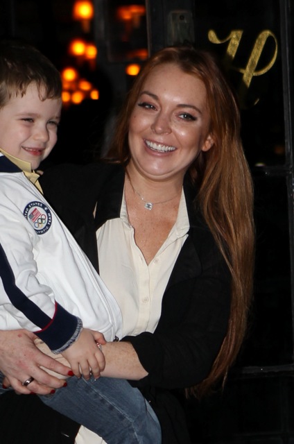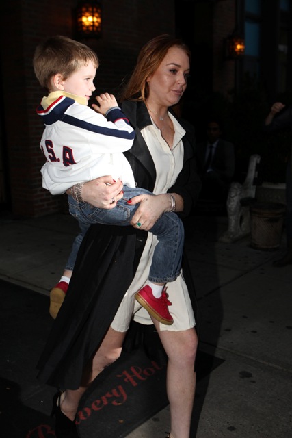 And attached - Lohan in New York yesterday carrying a child presumably belonging to that bearded dude behind her, Domingo Zapata. He’s 39. He’s a very, very wealthy artist. He loans her his Porsche when she’s in town. They hang out together with Vikram Chatwal. Chatwal owns the hotel she’s been staying at while in NYC. Remember these seedy photos? And don’t pretend you’re not thinking what you’re thinking because I’m thinking it too, because in these circles, with those people, when is friendship ever free?