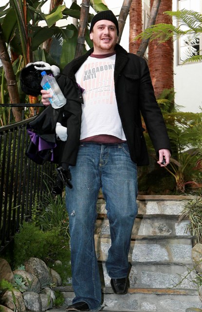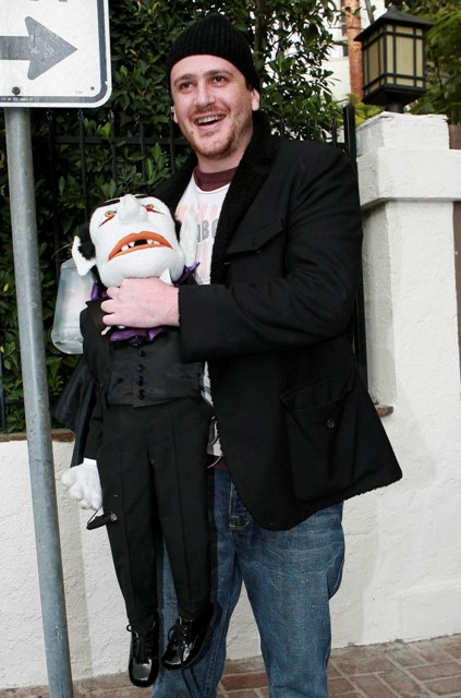 On Friday night it was a sleepover at Jason Segel’s. They’ve been linked before but this time she stayed at his place until well after 4 in the afternoon, caught by the paps on her way out while he randomly started posing with his Dracula puppet from Sarah Marshall.