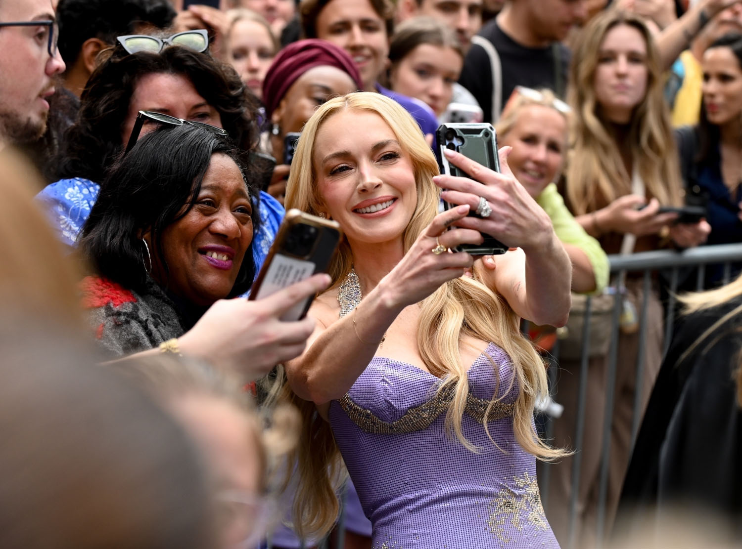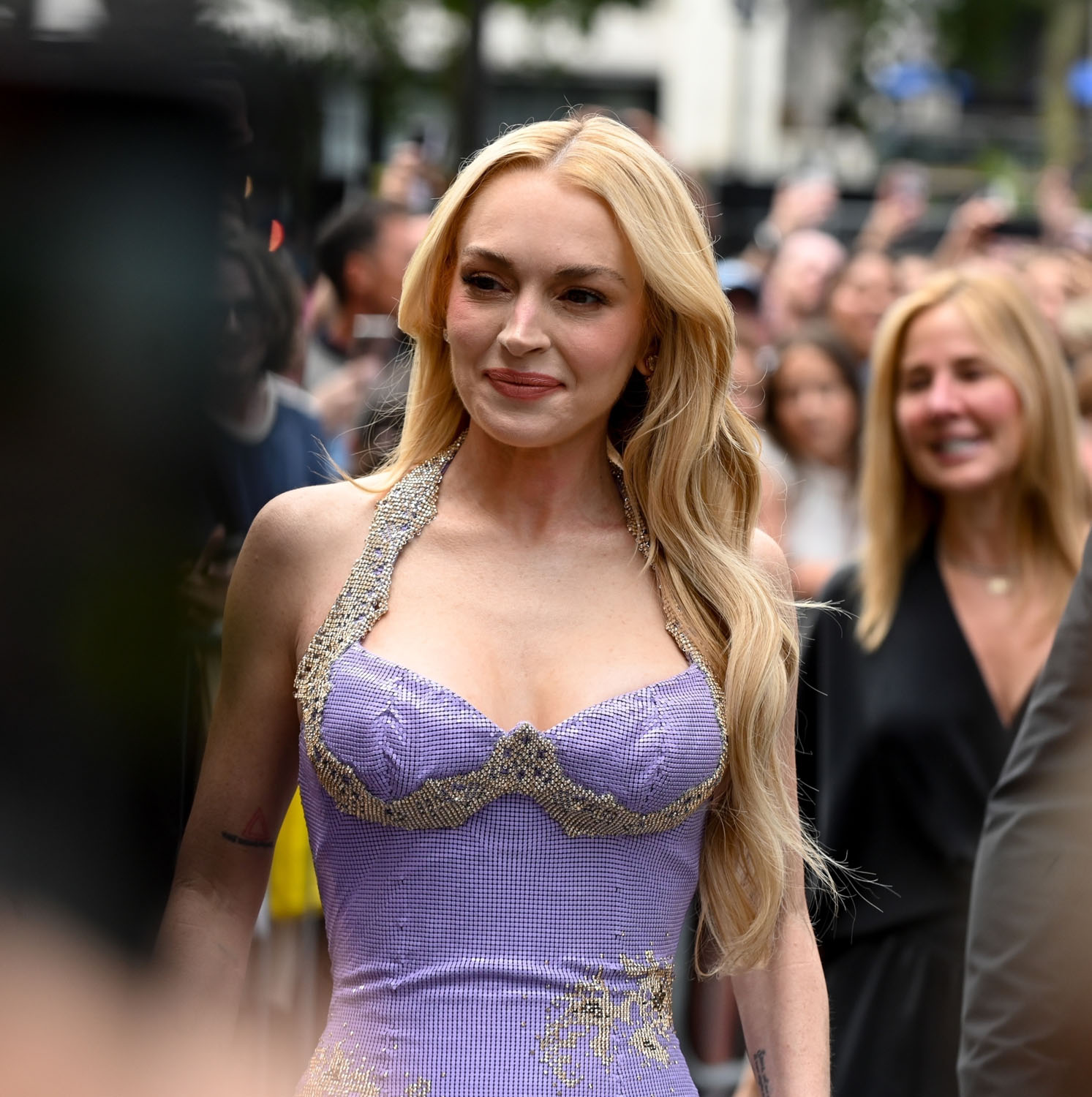 I said it was a flex yesterday the way Andrew Mukamal has been styling Lindsay Lohan as a tribute to her own career, and that continues today at the London premiere of Freakier Friday. Here she is in a small-sequin purple dress that’s meant to reference a key scene from the first movie, what Anna wore to the wedding.