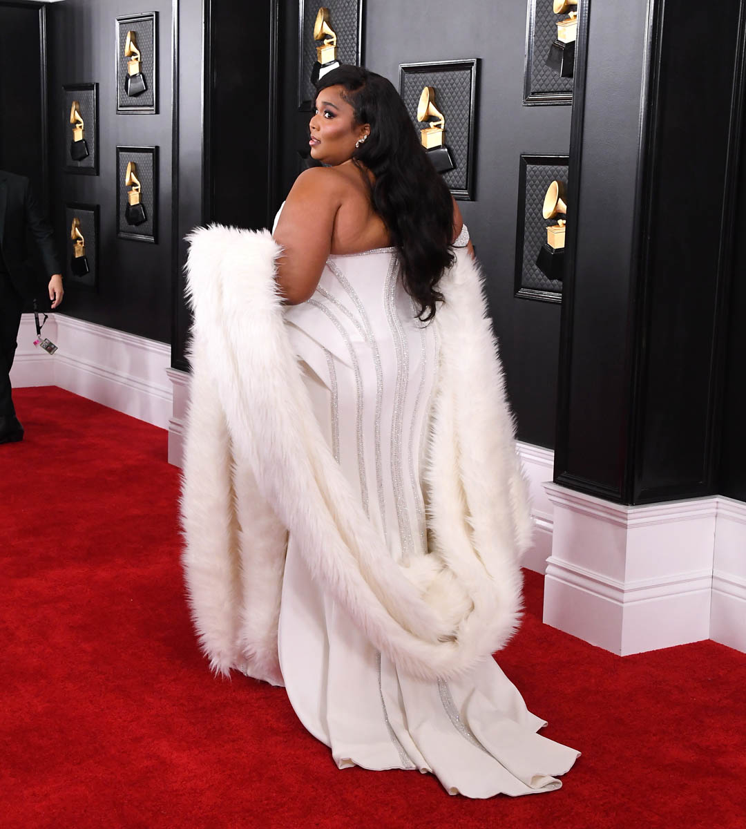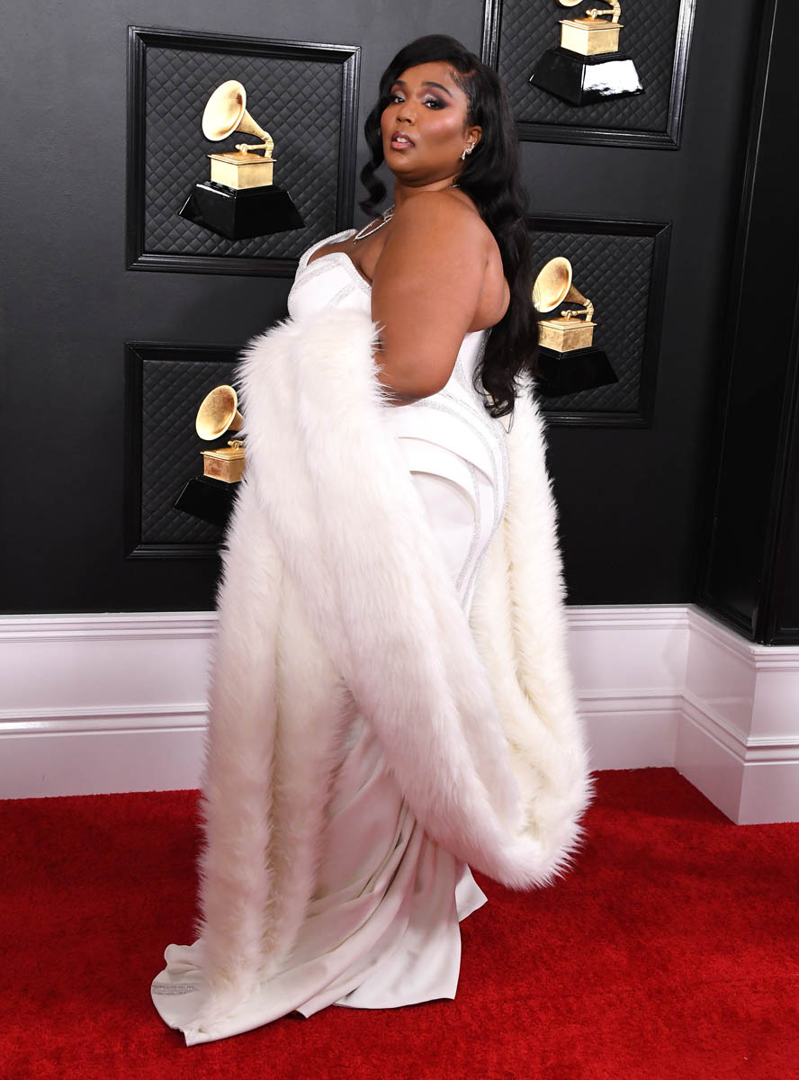 That’s what Lizzo was serving with multiple looks, all of them over-the-top, oozing with glamour and excess. Let’s start with the carpet look and it was a great choice for the carpet: white, old Hollywood but modernised, elegant but also sexy without compromising on luxury. This dress looks LUXE.