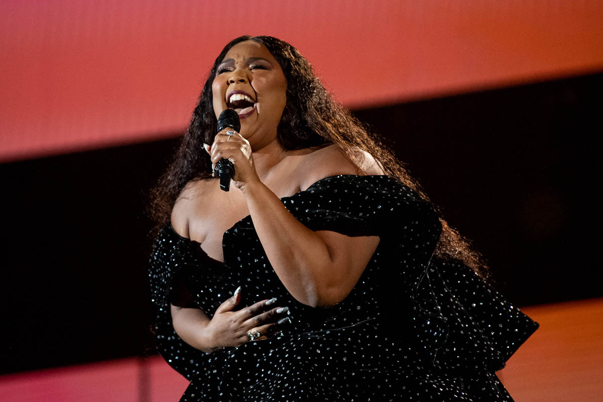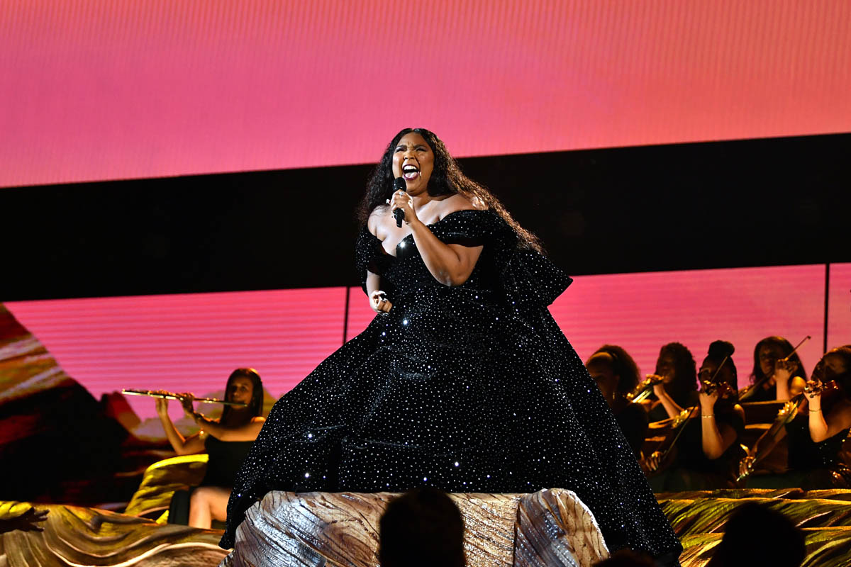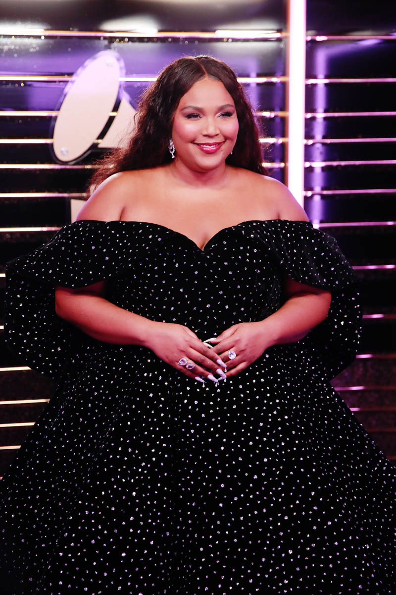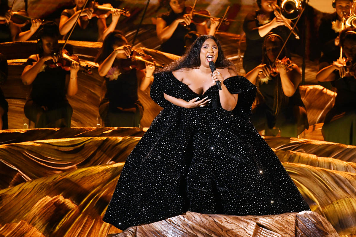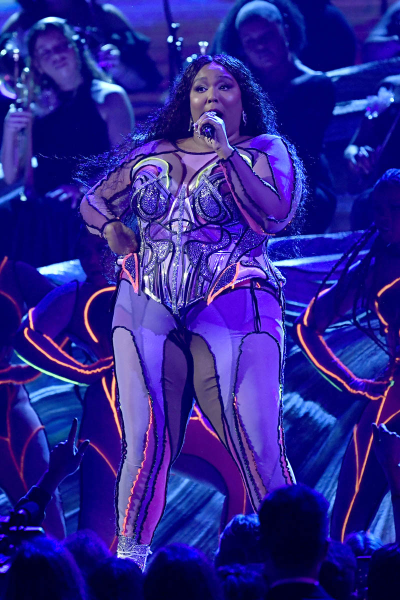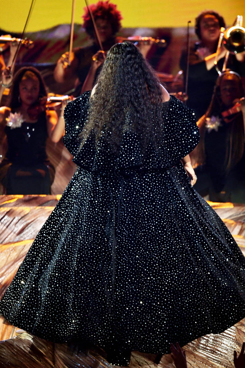 As did the black sparkly gown she wore to open the show. Lizzo can open a show. The only problem with Lizzo opening your show is that after she’s done… where do we go from here? The risk is that it’s all downhill. The great thing about this black dress is that it’s decadent and rich without weighing her down. She could still move, freely, and you can imagine how she must appreciate that in a garment. That she’s not sacrificing performance for look.