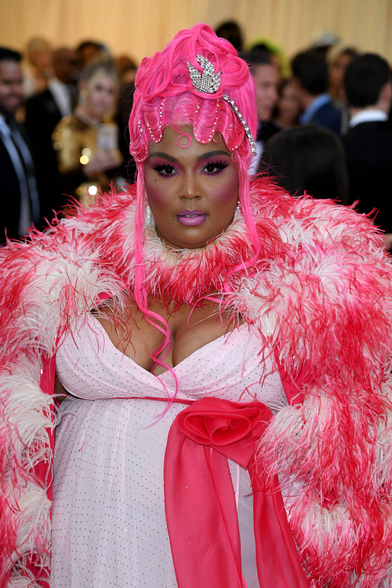Here’s Lizzo at the Met Gala on Monday night. As we know, Anna Wintour approves the guest list, and she invites celebrities that are not only famous, but currently relevant. Lizzo, the singer, outspoken fierce femme, flautist, and most recently animated voice actor, is enjoying an explosive ascent, whether you discovered her recently or when she dropped her first album 6 years ago. She was gorgeous and on theme in a feathery show stopping Marc Jacobs outfit with pink hair and an intense headpiece. She even wore the amazing cape to the airport the next day.
