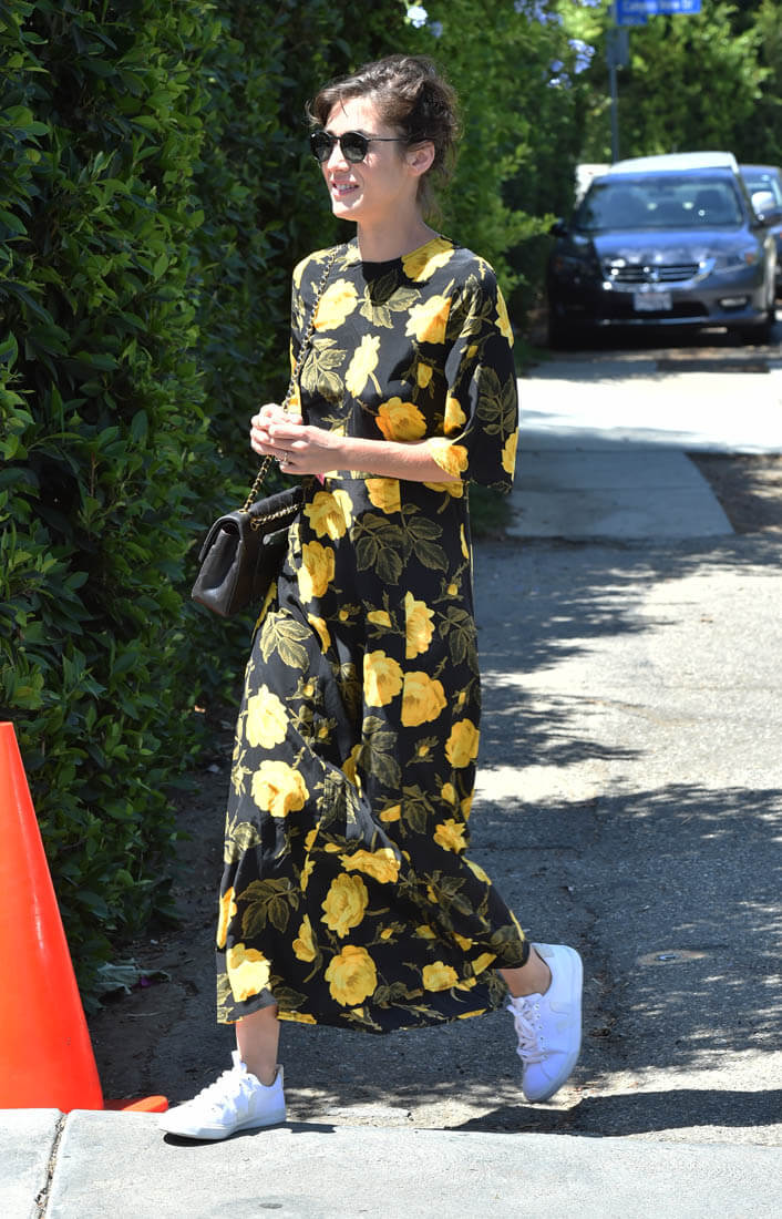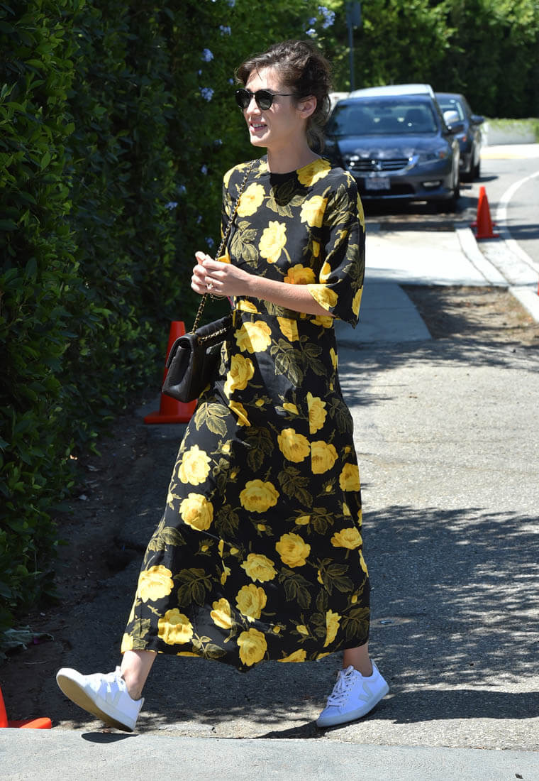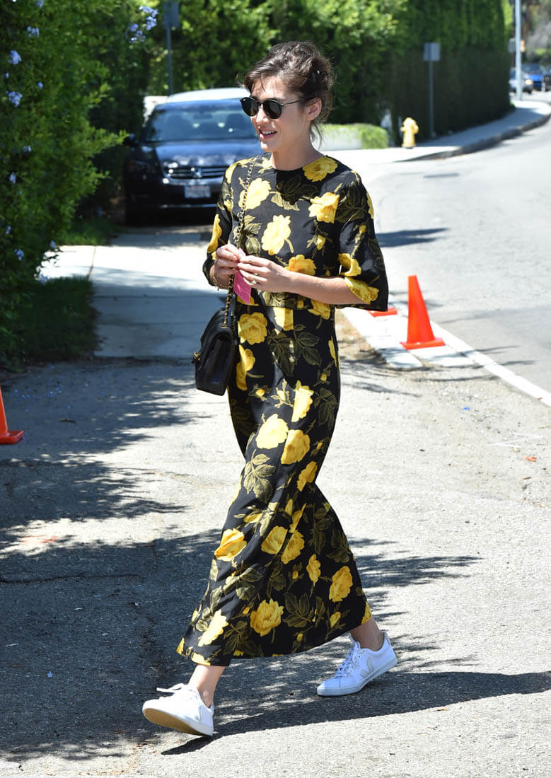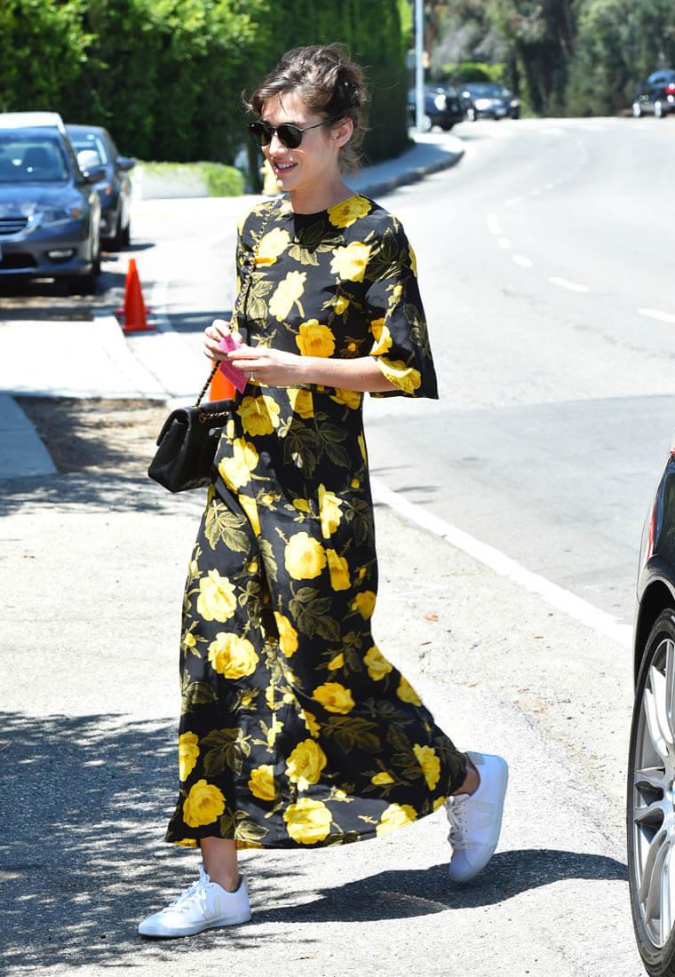 Black and yellow floral pattern with crisp white kicks. You in? I’m in. If you spend so much money for a dress that you originally intend for nighttime but a pair of sneakers can make it work for daytime, it’s an automatic value-add.