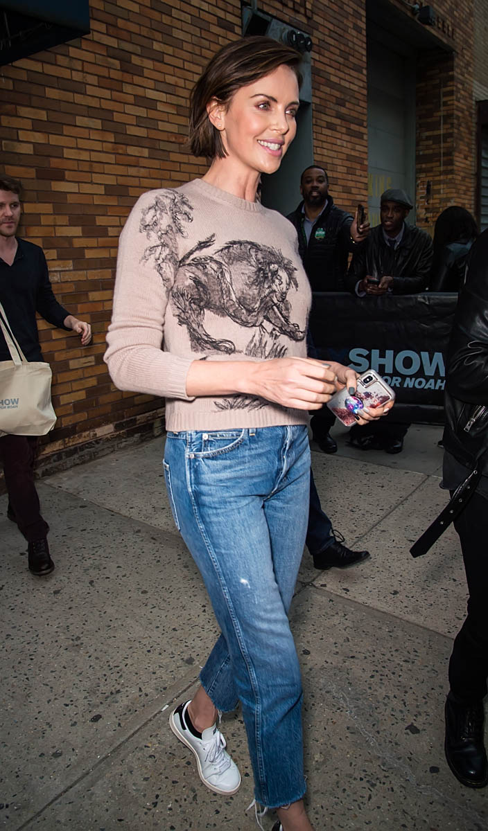 Attached - Charlize and Seth out in New York this week for Long Shot promotion.