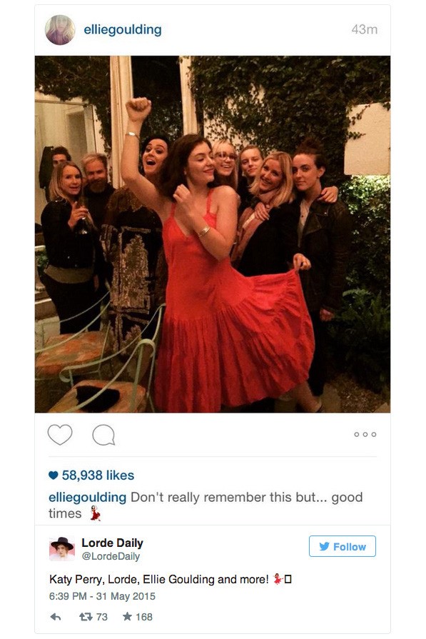 Taylor Swift, as we know, as we’ve seen, repeatedly, every day, everywhere, is friends with everyone. With one exception: Katy Perry. OK two. Katy Perry and John Mayer. But two of her friends, Lorde and Ellie Goulding were partying recently with Katy Perry. The evidence is on Instagram.