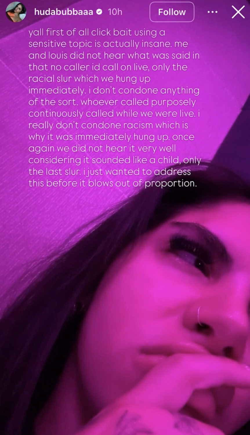“Y’all first of all click bait using a sensitive topic is actually insane. Me and Louis did not hear what was said in that no caller ID call on live, only the racial slur which we hung up immediately. I don’t condone anything of the sort.”