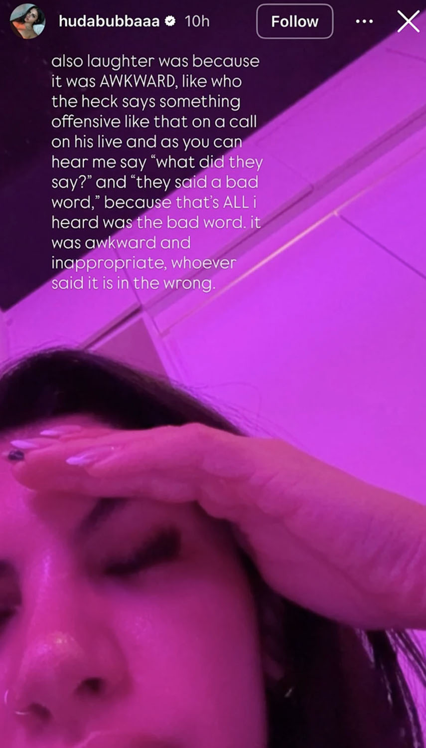 In a response that many social media users agree was inappropriate, the pair burst into laughter after the caller said the slur, then disconnected the call with the unknown perpetrator. Huda took to her Instagram stories to explain her reaction. In a two-part post, she said: