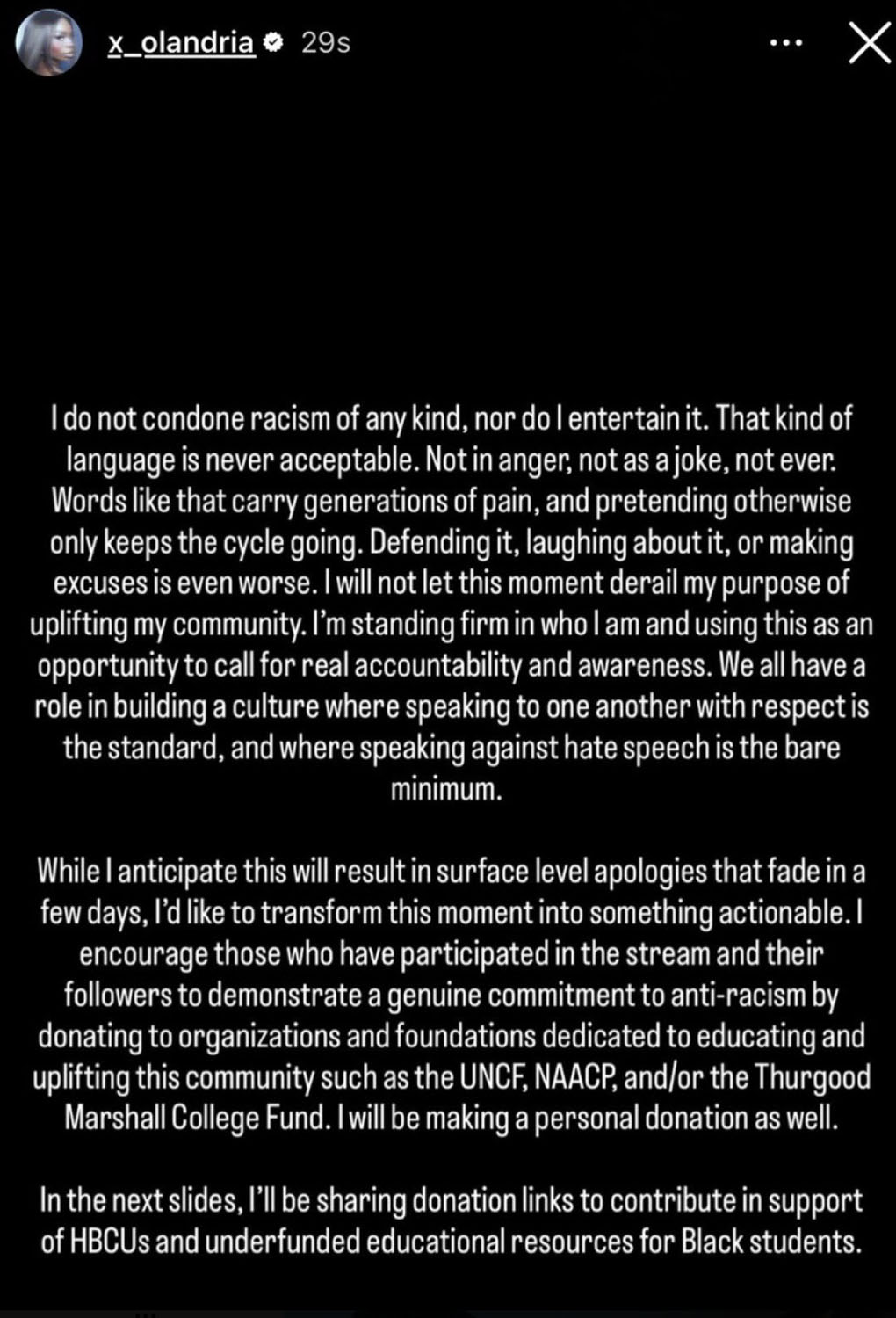 Love Island’s Olandria Carthen is speaking out in response to a clip featuring another Love Island alum, Huda Mustafa, and her partner Louis Russell, laughing in response to someone hurling the n-word at her during a livestream.