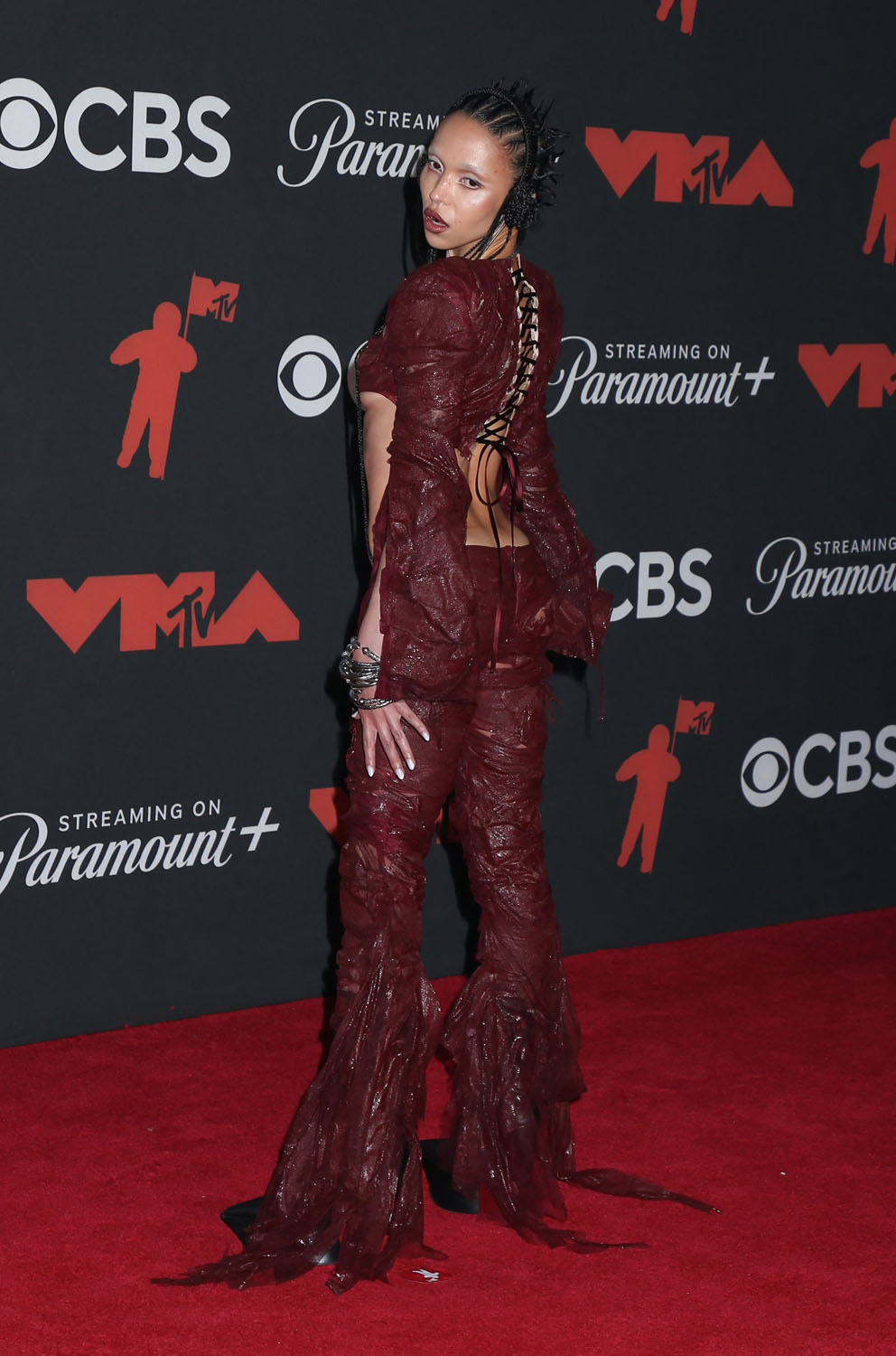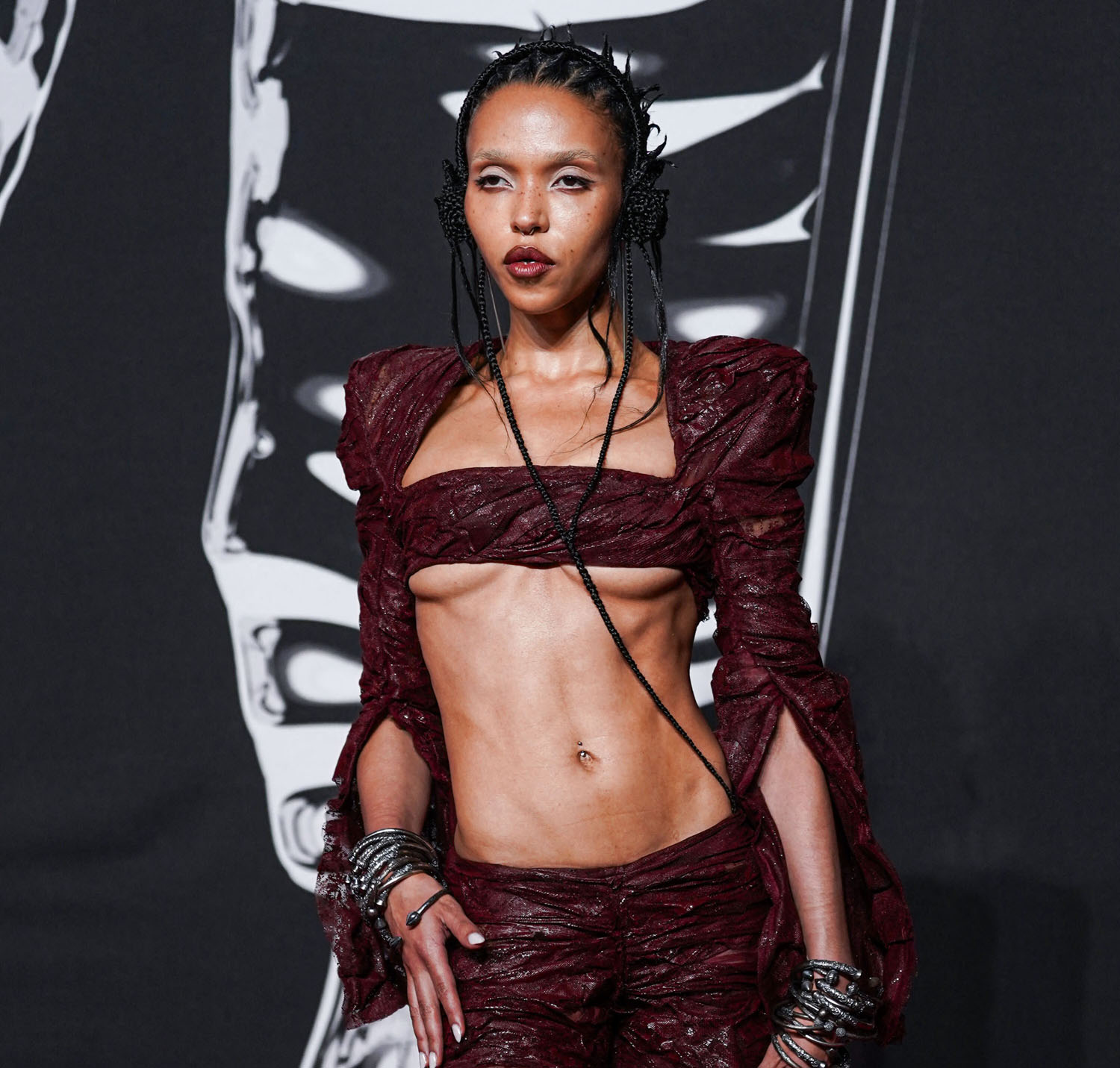 FKA twigs, on the other hand, while certainly serving body-ody, seems to be wearing what I can only describe as looking like an alligator print Birkin bag cut into a two-piece costume. You can disagree with me if you choose of course, she still looks incredible, the outfit just isn’t doing it for me. The good news for FKA is that while the outfit may not be the most glamorous, her hairstyle gets 10s from me as her hair is braided into the form of a pair of headphones.