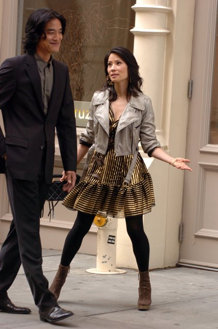 After what appeared to be a shaky start, looks like Patricia Field has found her footing – Lucy Liu’s wardrobe in Cashmere Mafia has shown significant improvement. And this outfit is no exception. That little dress is unbelievable. And that man beside her is even better.