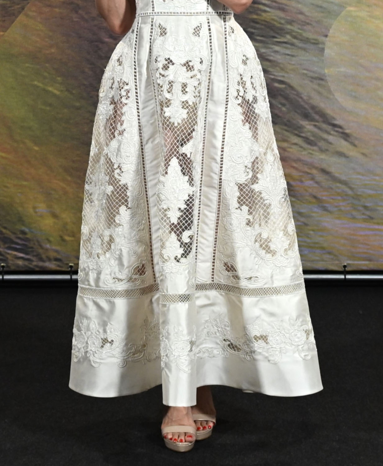 That’s a perfect summer event dress. In a color other than white, I could see someone wearing that to a chic summer wedding…featuring a cool bride who’s into sheer. Sheer is not something you spring on unsuspecting brides on their big day, I firmly believe this. She also wore a silver number that is also sheer AND has a capelet for which I did not get a dress ID on time, but I don’t care for this look as much as I do the mesh one.