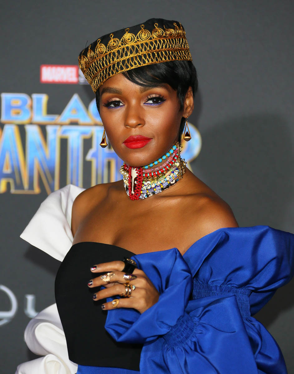 Ruth E. Carter better win all the Oscars for costume design for this movie. To Variety, Carter called the style of Black Panther “Afro-futuristic.” If anyone can claim to have gotten the “Afro-futuristic” memo –with a regal twist— it’s Janelle Monae. LOOK AT JANELLE MONAE. I can’t. I’m crying again. Janelle is in a royal blue and black Christian Siriano gown looking like an African goddess who came back in time from 2045 in her glammed up, crown-esque version of a kufi cap.