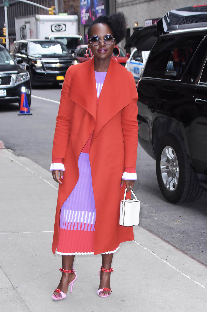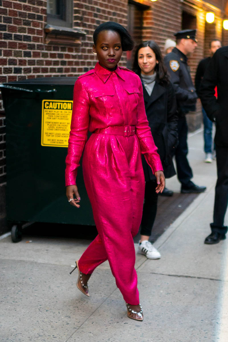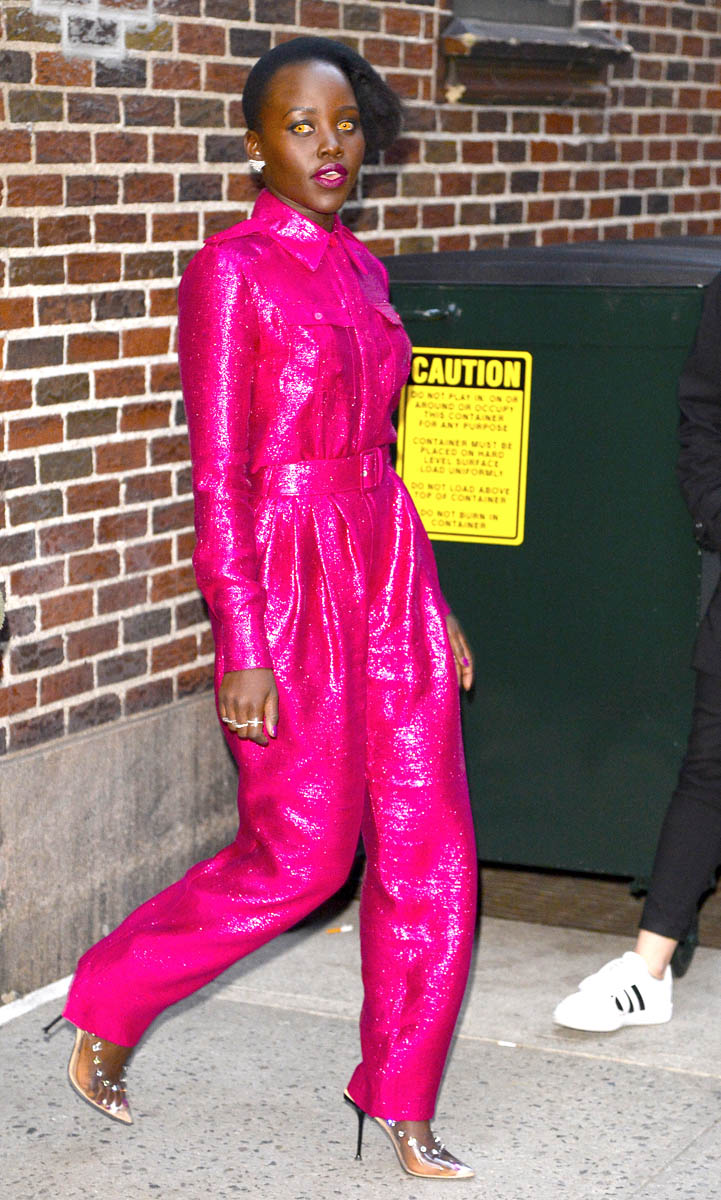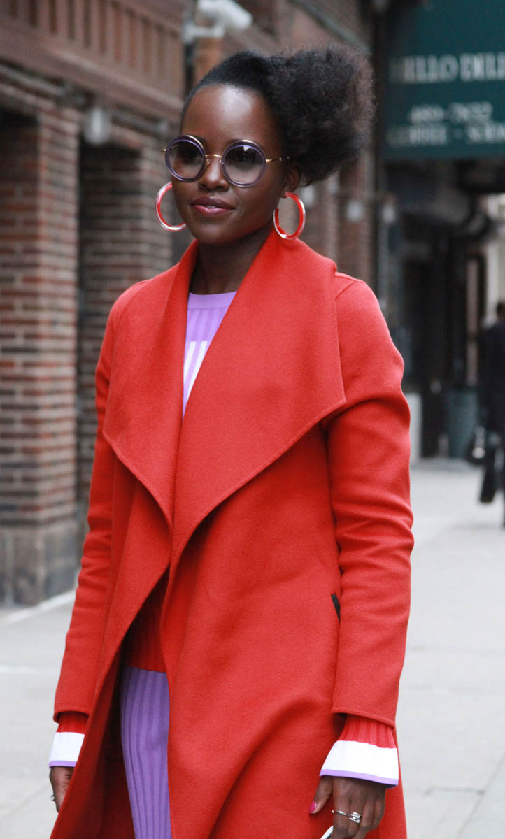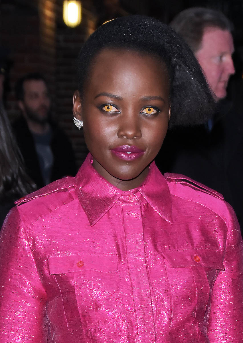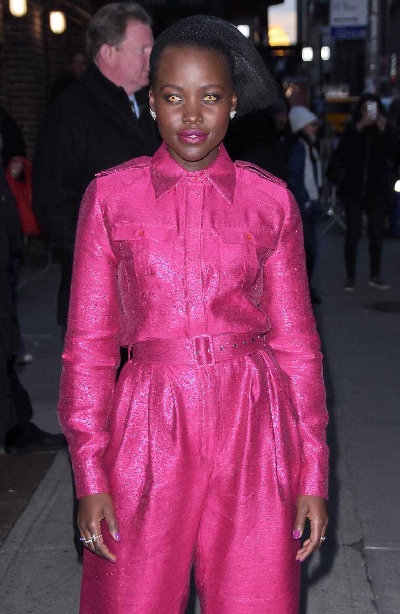 Here’s the star of Us, Lupita Nyong’o, in New York yesterday determined to freak us all out with those eyes. She did it last week at the premiere in London and, while it’s a scary trip to look at, I appreciate that she’s incorporating the horror element into her promotional wardrobe. Colour contact lenses like this are not comfortable – because they’re temporary, not meant for every day use but for costuming, so they’re typically sold without customisation. Lupita is a celebrity, sure, and maybe she had hers special ordered. But if they weren’t, if they were bought the way we buy ours for Halloween, she probably couldn’t wait to take them off at the end of the night. Not that she would tell you that because part of the costume is to keep up the character and if we know Lupita, she’s excellent on a press tour. On this press tour in particular, since people are already starting to talk about her performance and awards prospects, she’s been killing it.