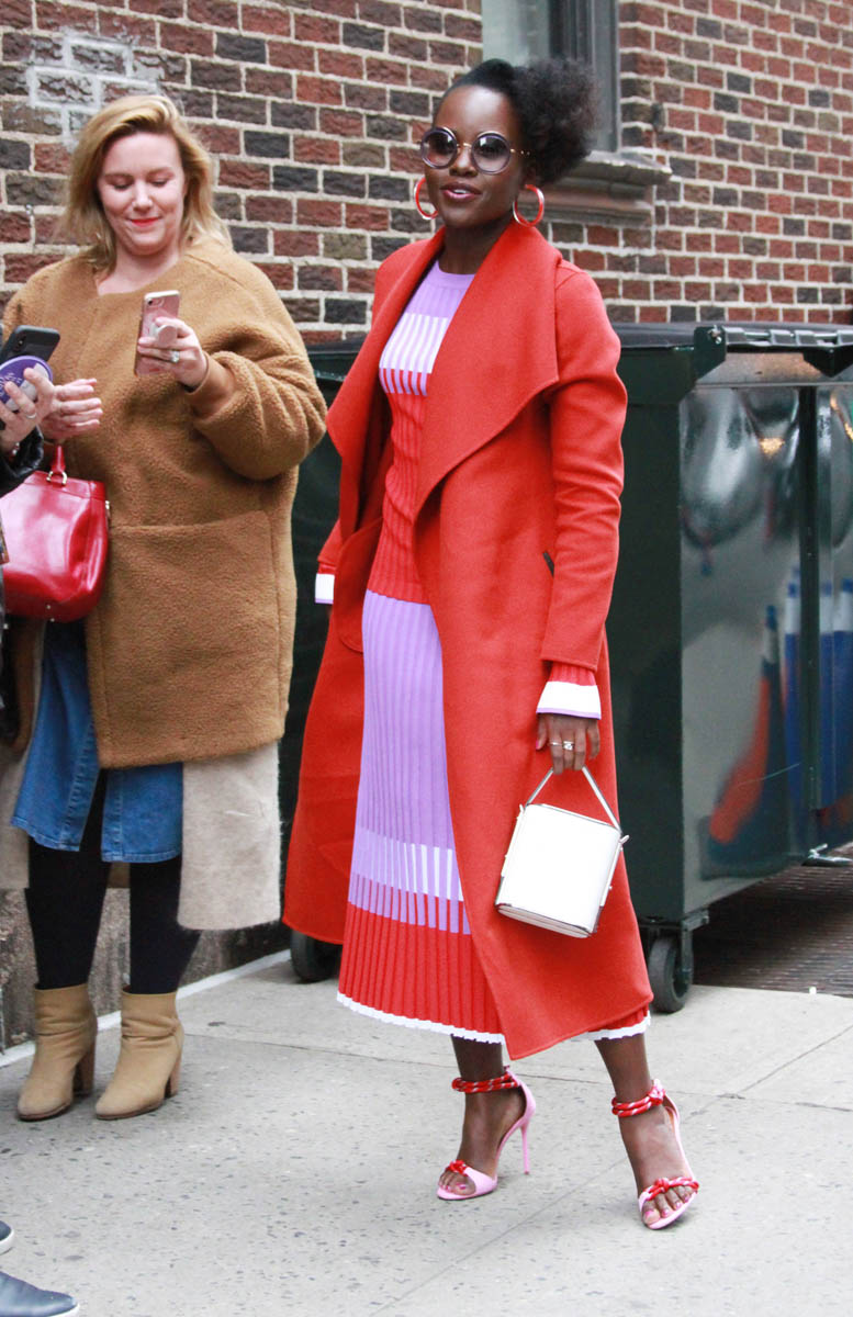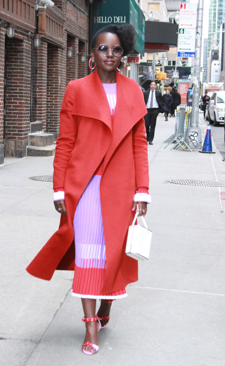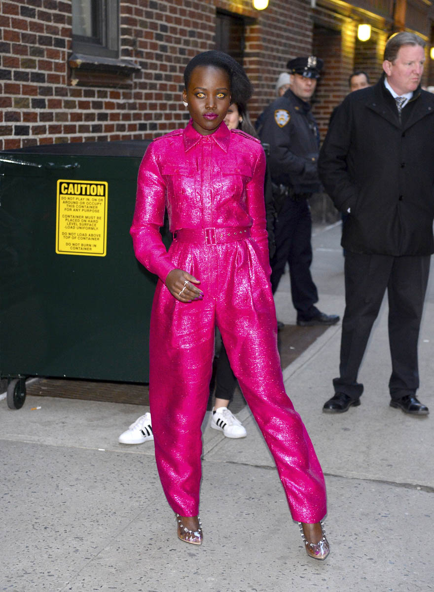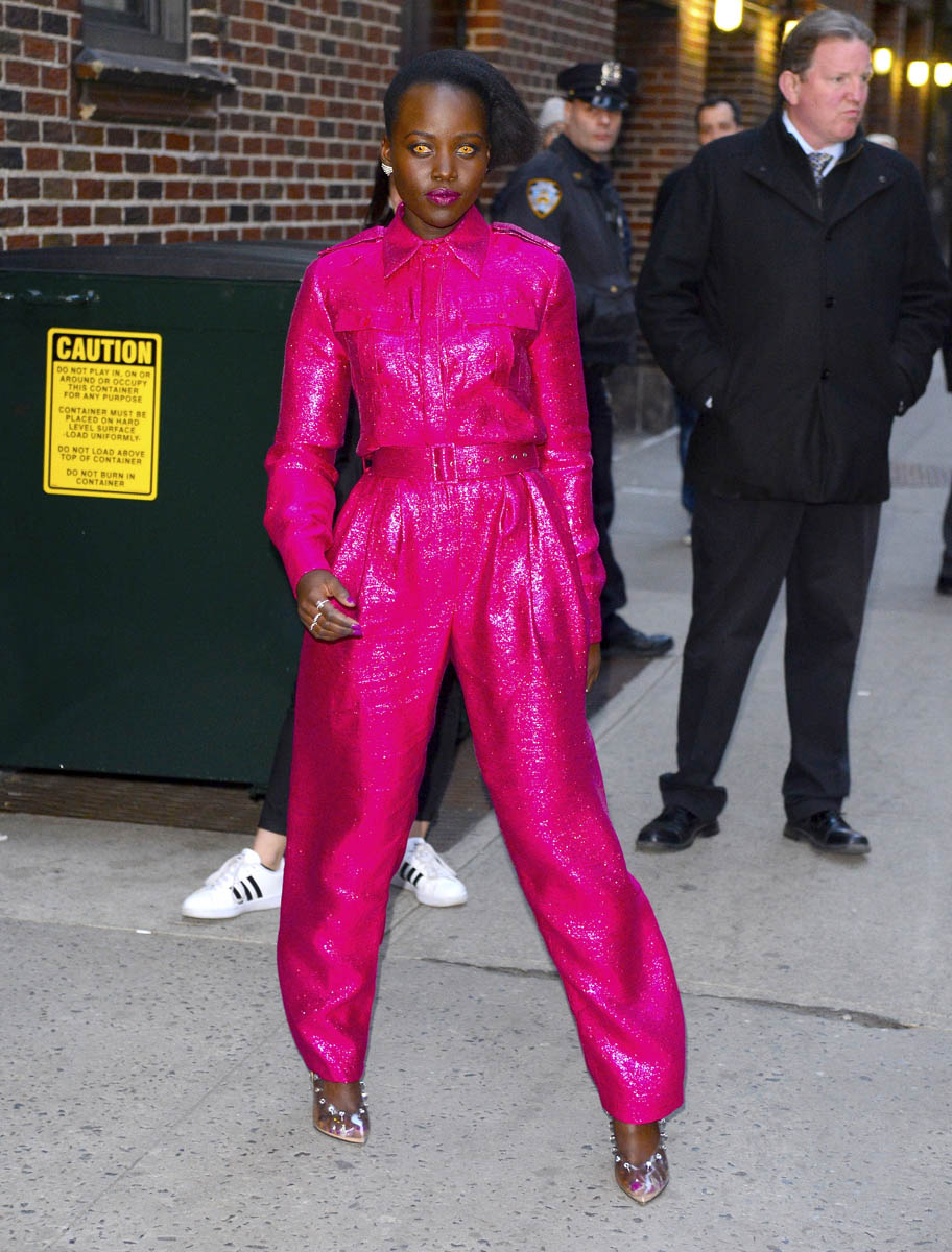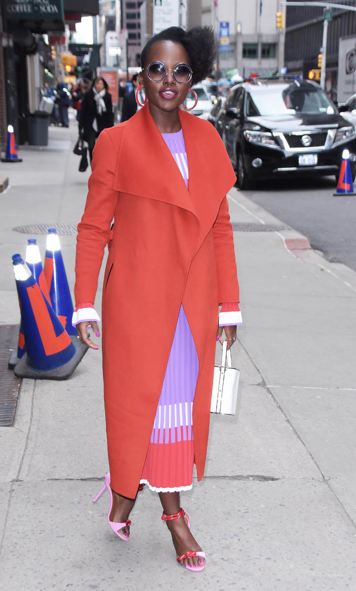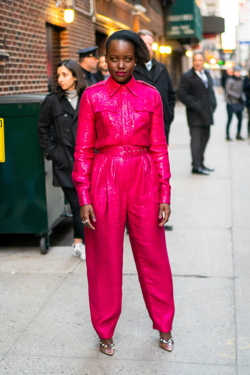 Here’s the star of Us, Lupita Nyong’o, in New York yesterday determined to freak us all out with those eyes. She did it last week at the premiere in London and, while it’s a scary trip to look at, I appreciate that she’s incorporating the horror element into her promotional wardrobe. Colour contact lenses like this are not comfortable – because they’re temporary, not meant for every day use but for costuming, so they’re typically sold without customisation. Lupita is a celebrity, sure, and maybe she had hers special ordered. But if they weren’t, if they were bought the way we buy ours for Halloween, she probably couldn’t wait to take them off at the end of the night. Not that she would tell you that because part of the costume is to keep up the character and if we know Lupita, she’s excellent on a press tour. On this press tour in particular, since people are already starting to talk about her performance and awards prospects, she’s been killing it.