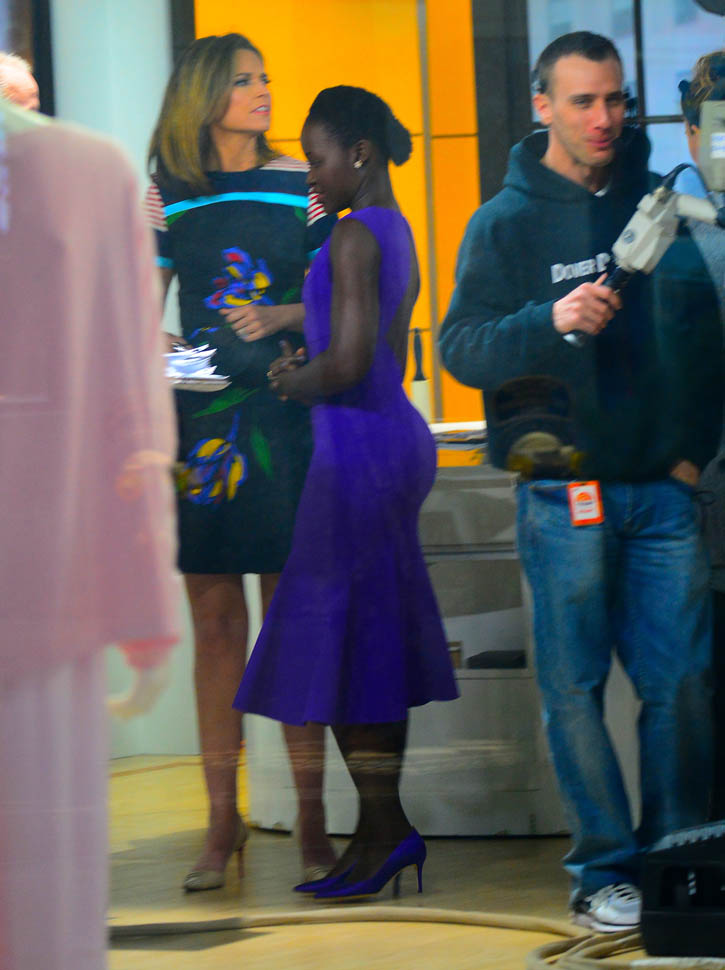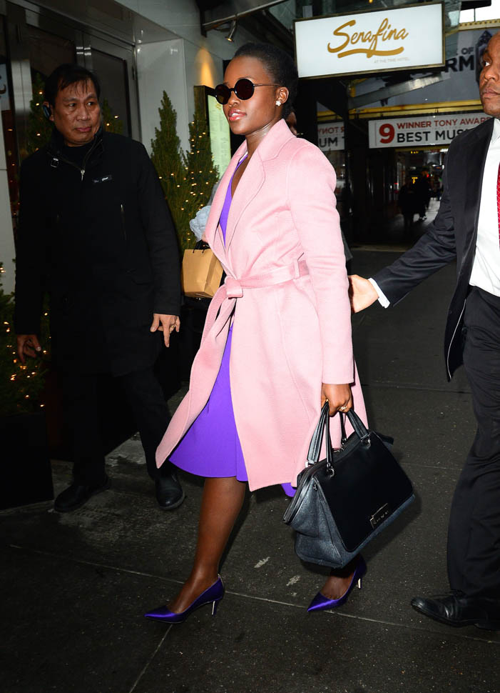 This looked purple to me when I first saw it, and then in other light it’s blue. I’m saying purple and you can yell at me later. But whatever it is, I’m not sure either way if I like it with this pink coat. Do you?