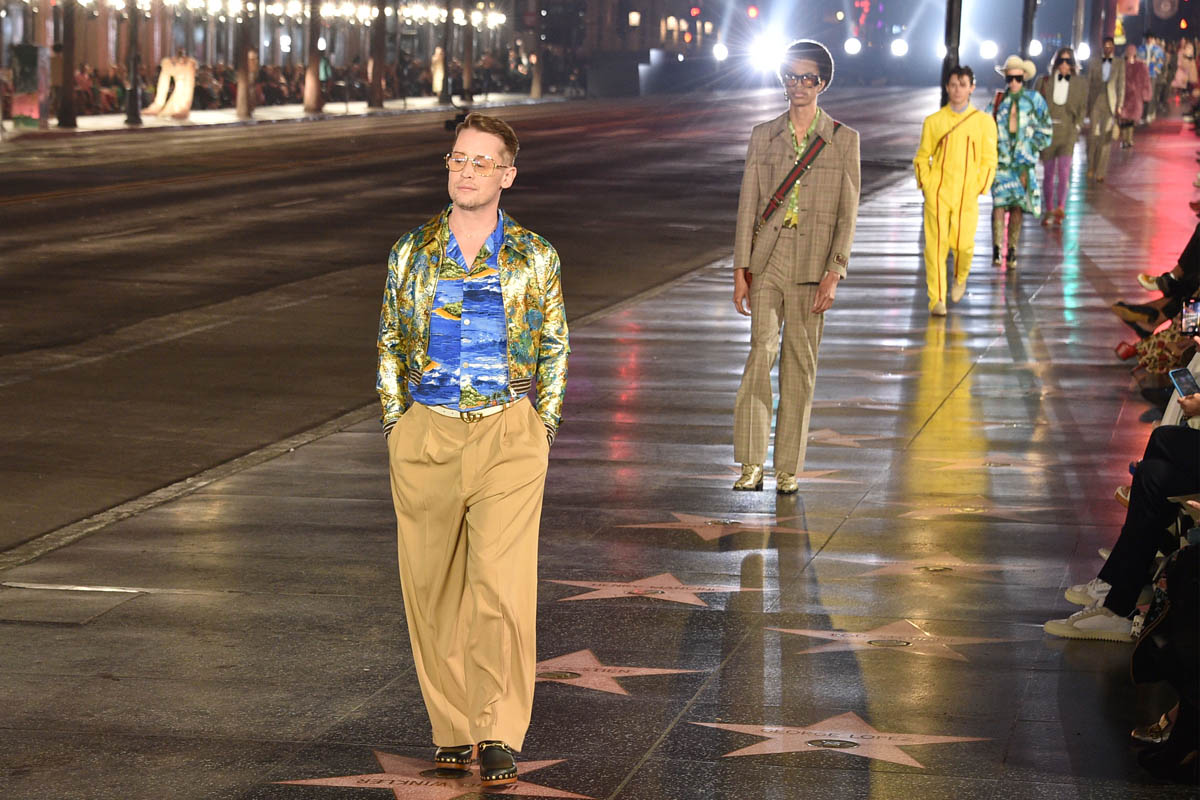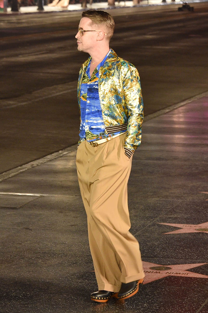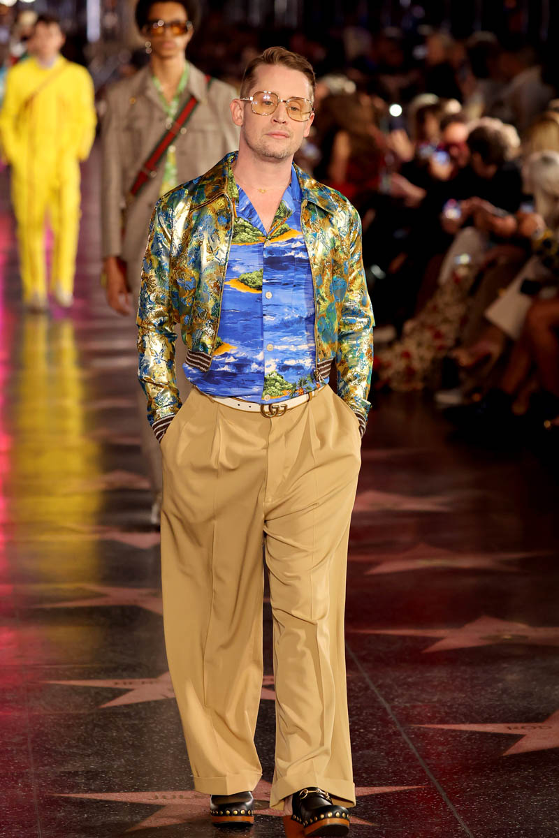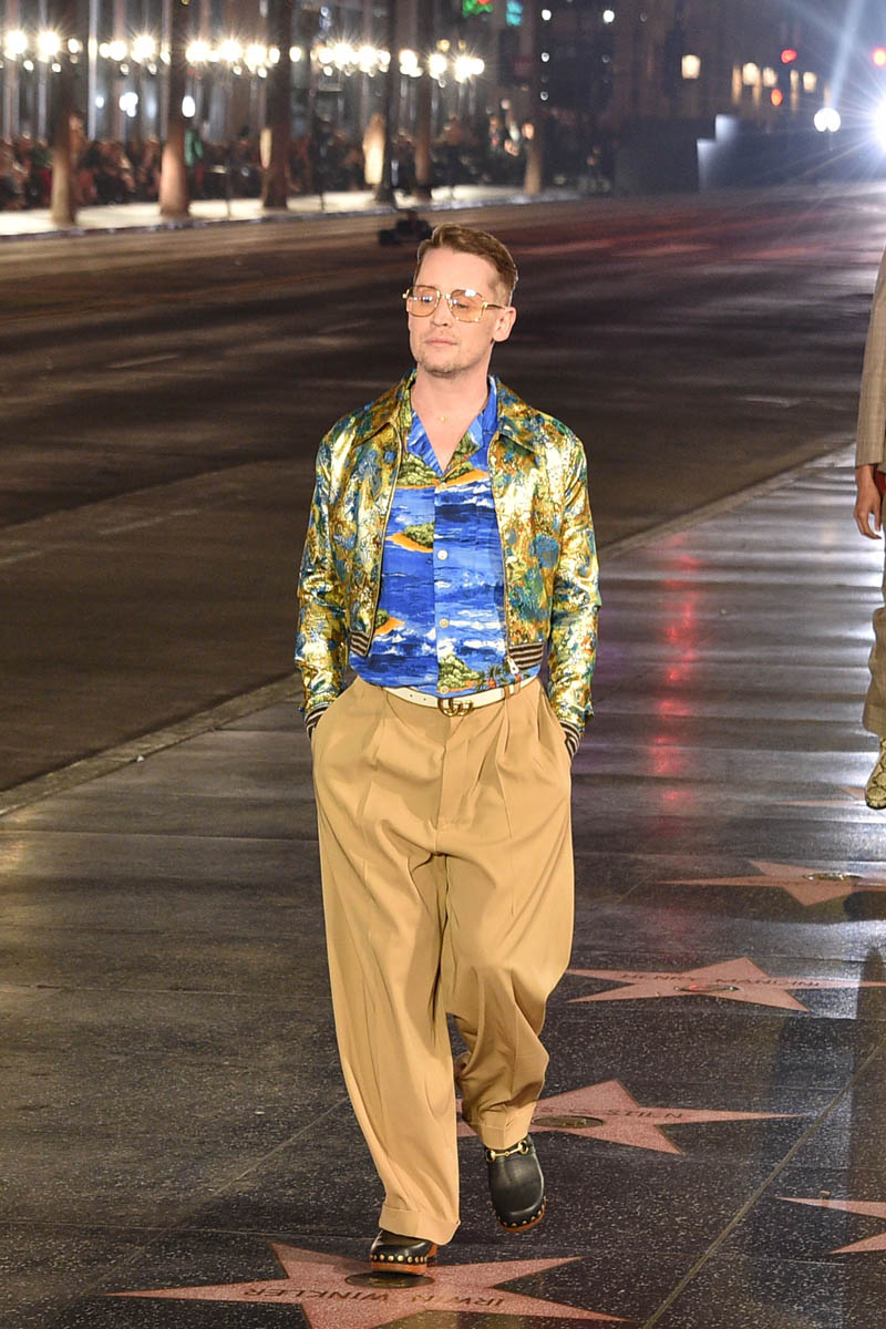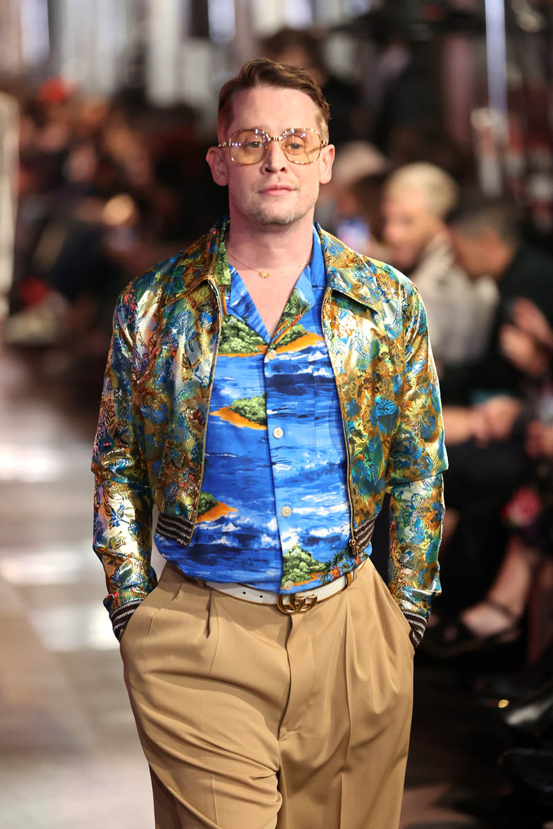 The Gucci Love Parade runway show was a mega-Hollywood affair, literally held in the heart of Tinseltown, on Hollywood Boulevard in front of Grauman’s Chinese Theaters. Models stomped down the Walk of Fame, and the audience and runway alike included A-list names. Jared Leto’s appearance on the runway is not surprising, given his role in the upcoming House of Gucci (who do you think was more extra on that set, him or Lady Gaga?), but Macaulay Culkin, on the other hand, was a surprising face amidst the celebrities and models walking for Gucci. He’s been working his way back into the popular consciousness for a while, but he has avoided high-profile events like this till now.