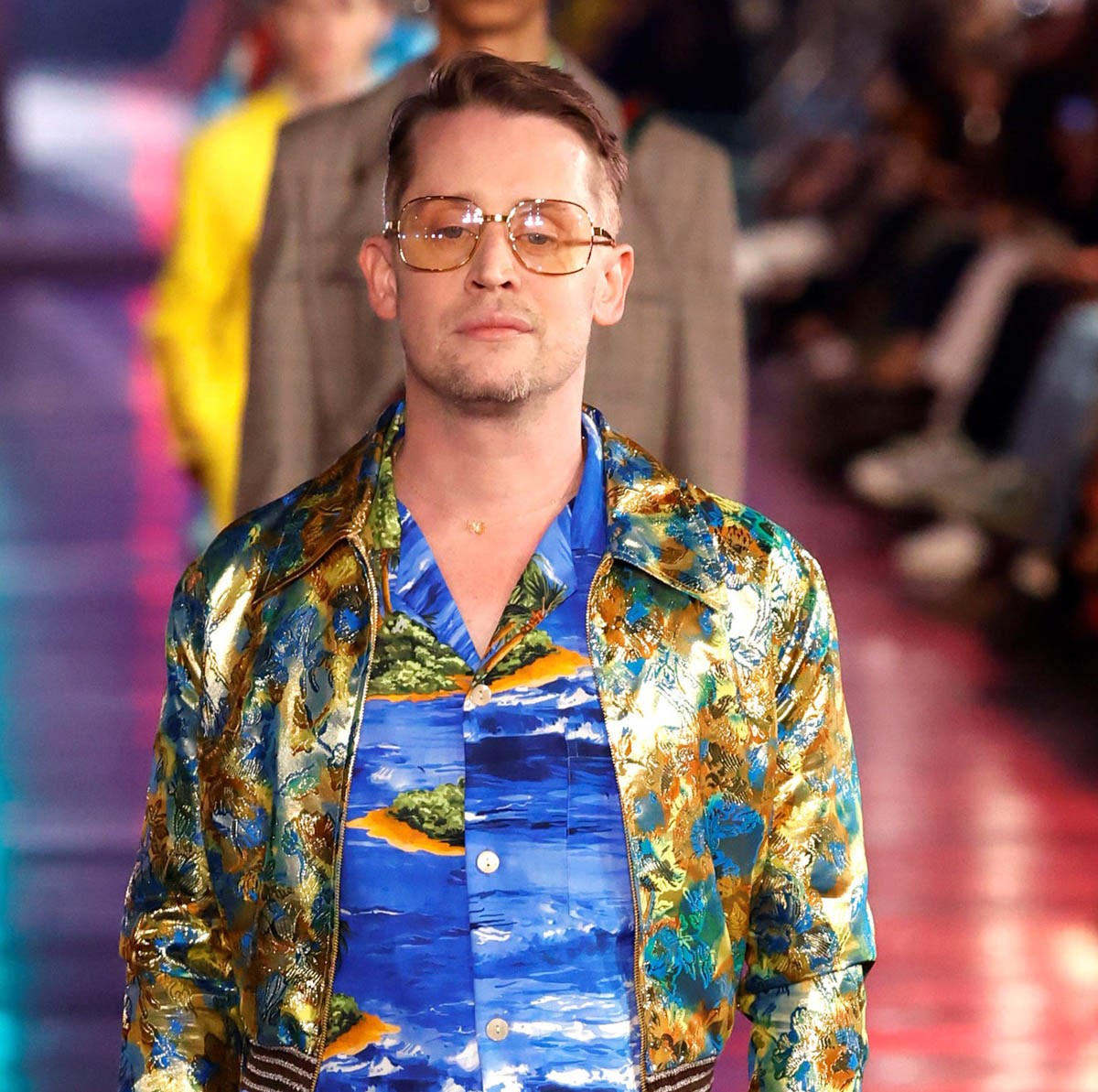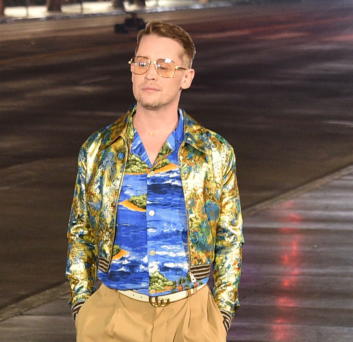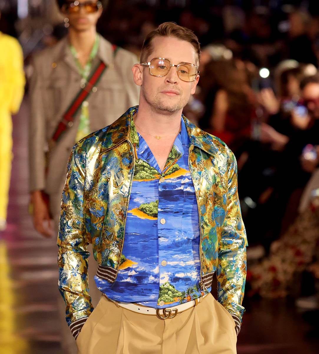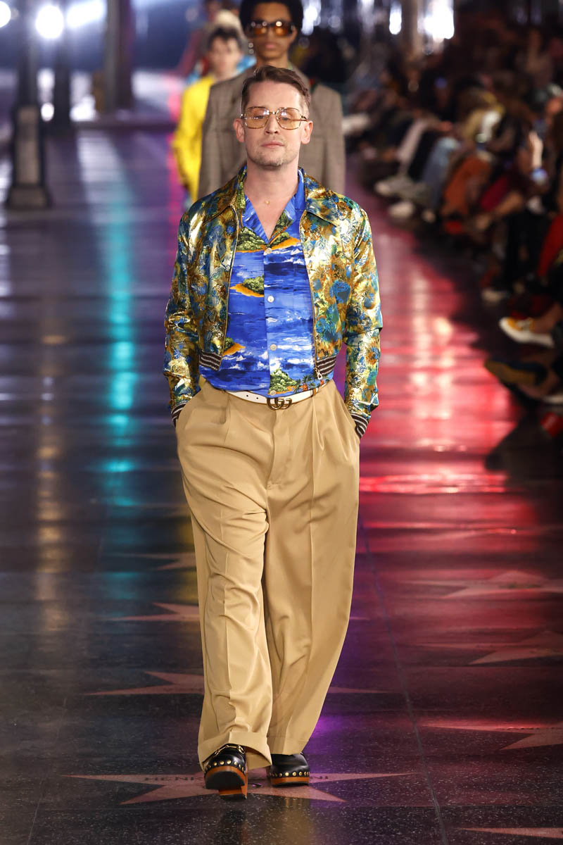 The Gucci Love Parade runway show was a mega-Hollywood affair, literally held in the heart of Tinseltown, on Hollywood Boulevard in front of Grauman’s Chinese Theaters. Models stomped down the Walk of Fame, and the audience and runway alike included A-list names. Jared Leto’s appearance on the runway is not surprising, given his role in the upcoming House of Gucci (who do you think was more extra on that set, him or Lady Gaga?), but Macaulay Culkin, on the other hand, was a surprising face amidst the celebrities and models walking for Gucci. He’s been working his way back into the popular consciousness for a while, but he has avoided high-profile events like this till now.