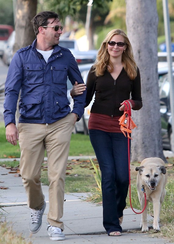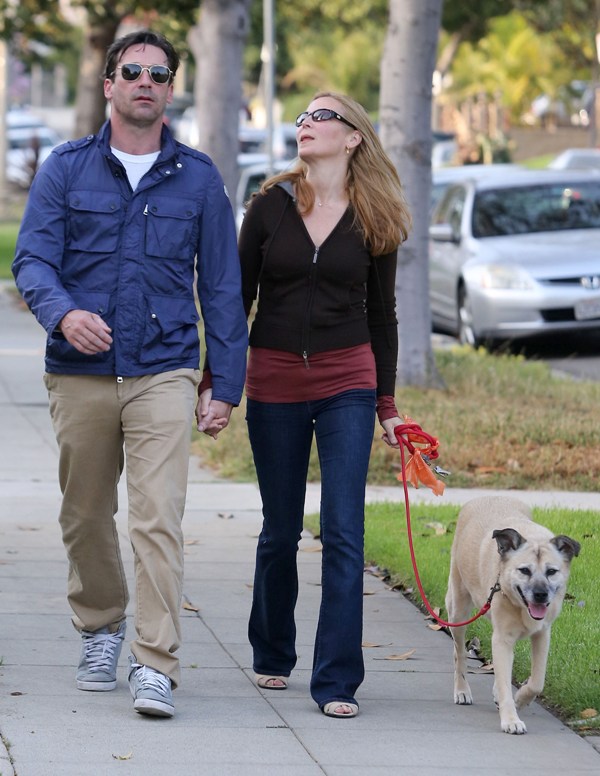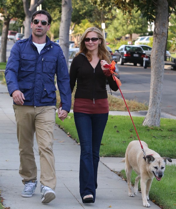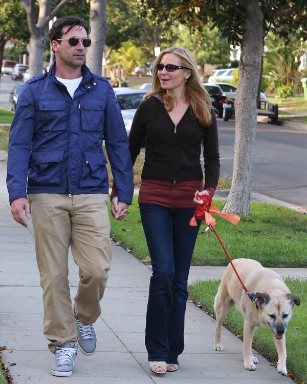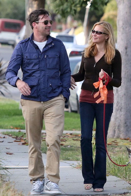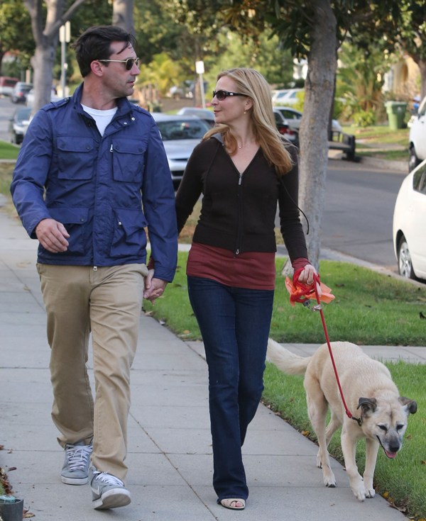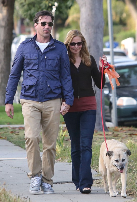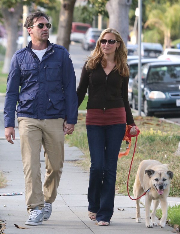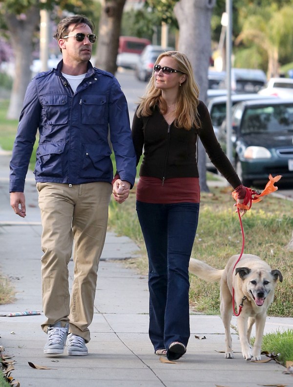 Attached -- Jon Hamm out with Jennifer Westfeldt and their dog this weekend.