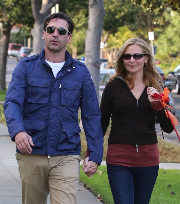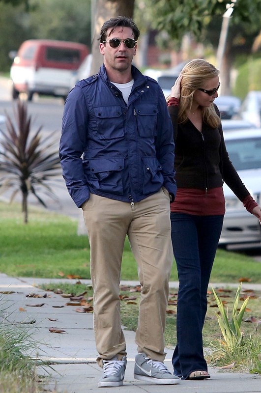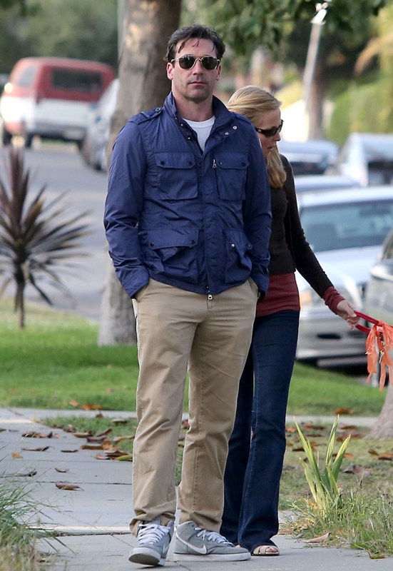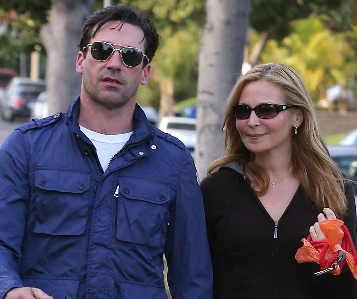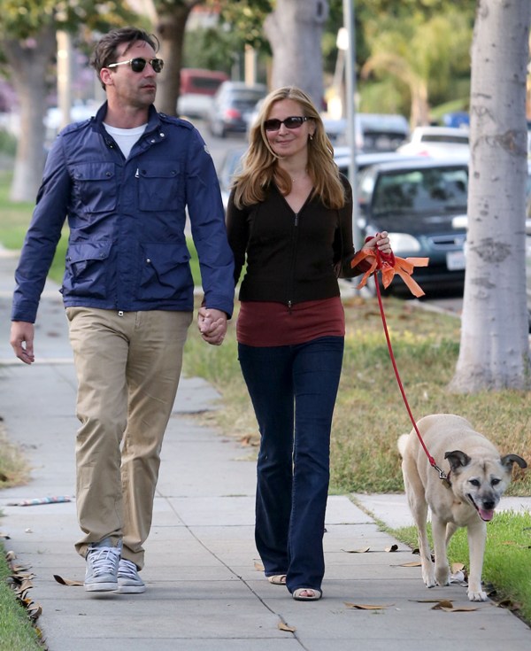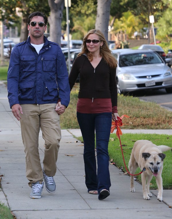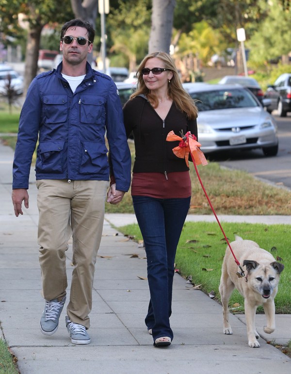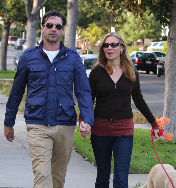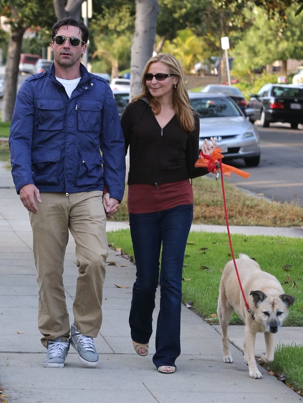 Attached -- Jon Hamm out with Jennifer Westfeldt and their dog this weekend.