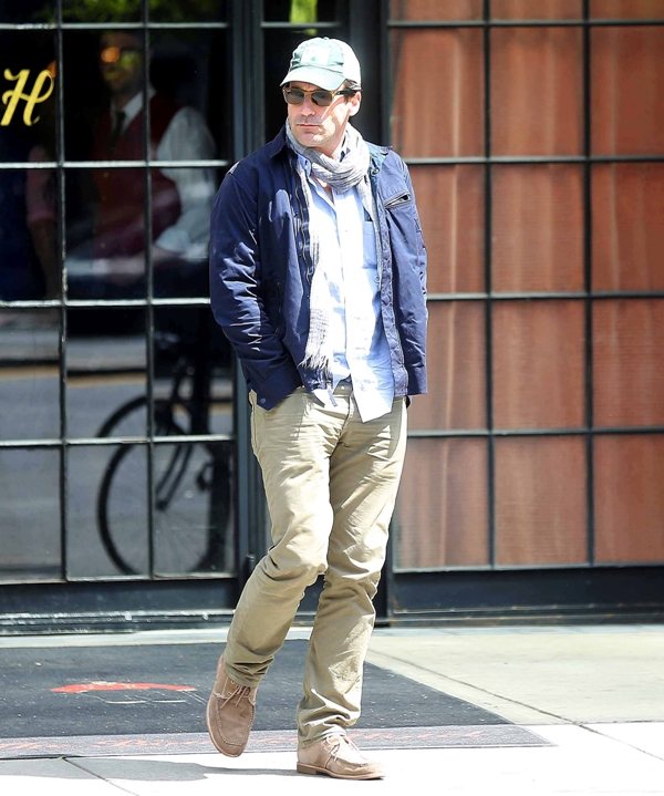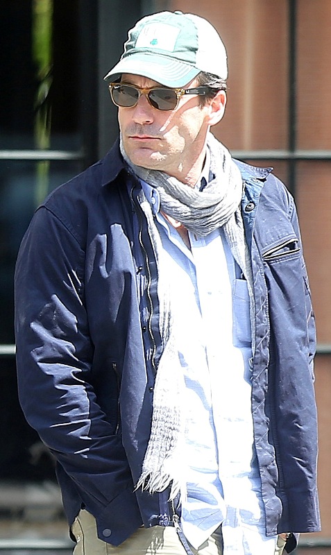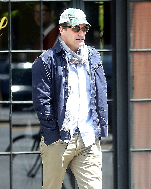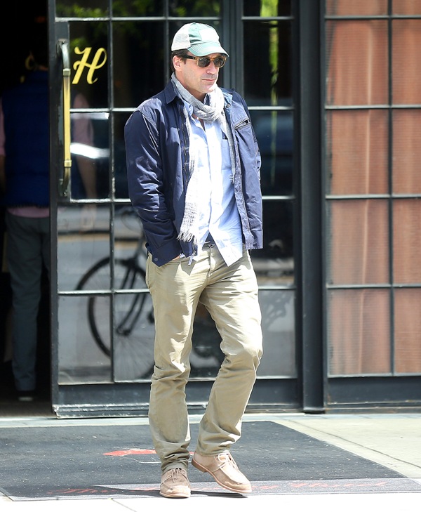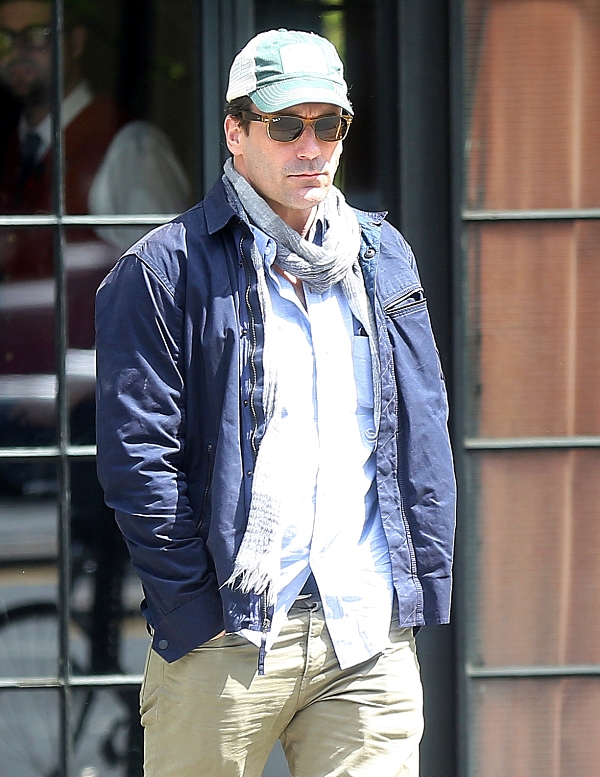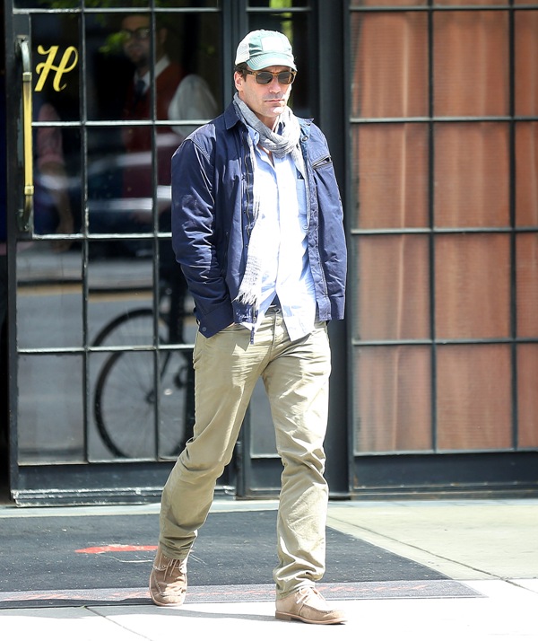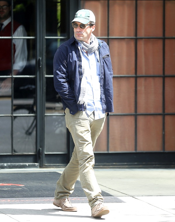 (Lainey -- here’s Jon Hamm walking around NYC yesterday wearing those pants pretty well, because I can’t see the OUTLINE OF HIS DICK.)