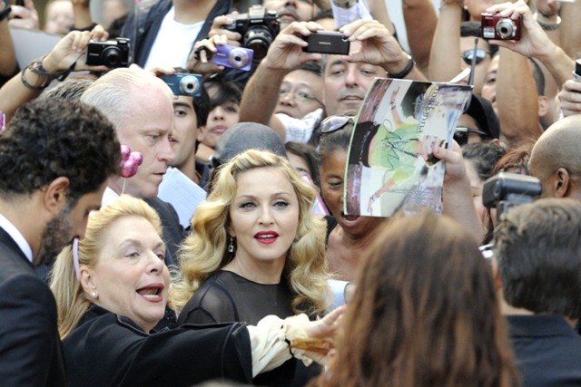 So this is Madonna at the TIFF gala premiere of W.E. last night. Now here’s the deal with the face - I remember seeing her last year at a party during Oscar week and writing that when you look at it live, it’s actually not as scary as it seems in photographs. Click here for that article. Everyone who saw her said the same thing last night. They all called her “beautiful”. I mean, yeah, she’s had work done, and she’s Botoxed all she can out of what she can get to but there are still lines and when right in front of you moving around and sh-t, it’s really not so jacked. Laura was on the carpet producing our live show last night and was with her for several minutes. If you’ve been reading my blog long enough, you know my friend Laura, um, doesn’t hold back with the bitch. And even Laura, who was eyeballing it up close, said that it’s really, really quite good.