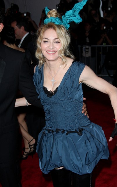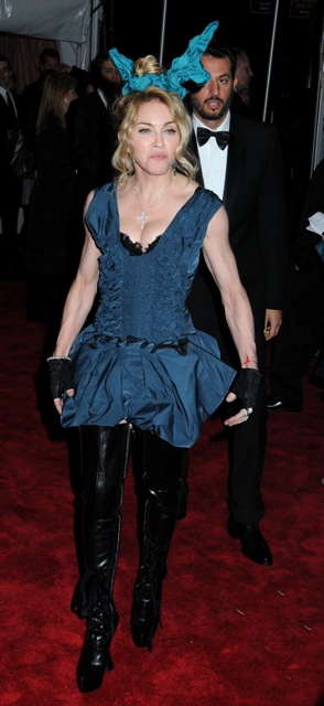We spent a significant amount time on this last night over Skype, Michelle and I. Obviously Madonna wasn’t hoping to make the Best Dressed List with this selection. Madonna is many things. But Madonna is not stupid. She wasn’t looking to the MiniVan to gasp with delight over that thing in her head and her muscles popping like flashbulbs.