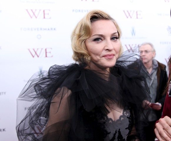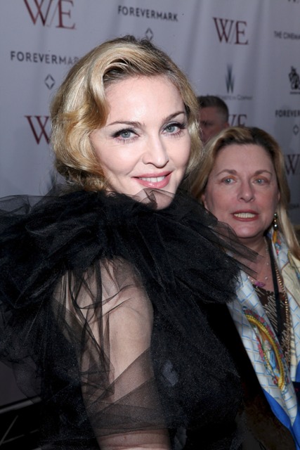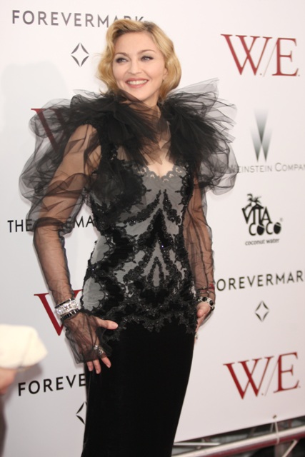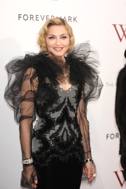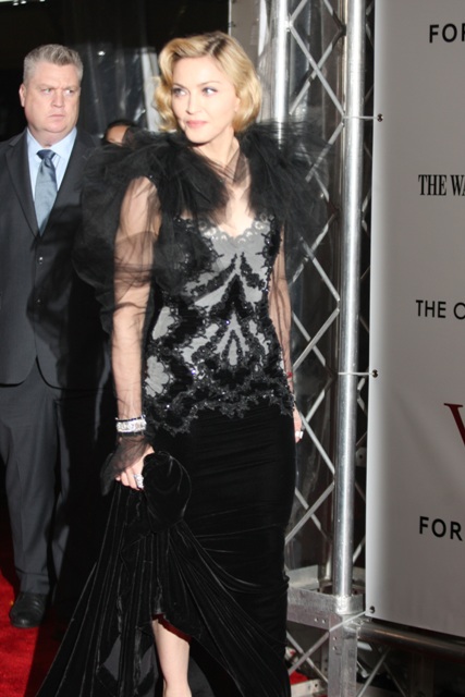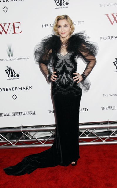 Here's Madge at the NY premiere of W.E. last night in Marchesa. As you know, 9.5 times out of 10, I can't deal with Marchesa. It's overrated, it's gawdy, it's obnoxious... and that means it's perfect for Madonna. Look at her, swanning about like she's in heat, in a gown made for a minor royal hanging on to her 50s. Princess Michael of Kent? She has her eye on this too.