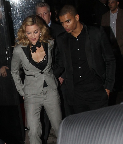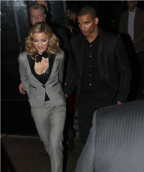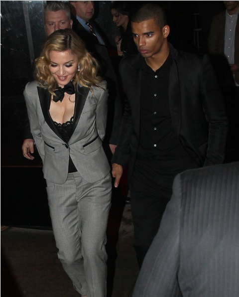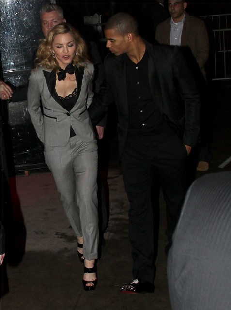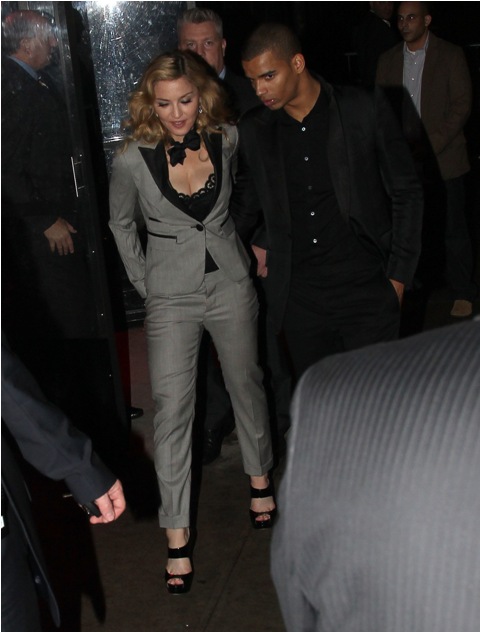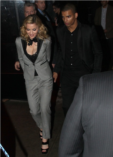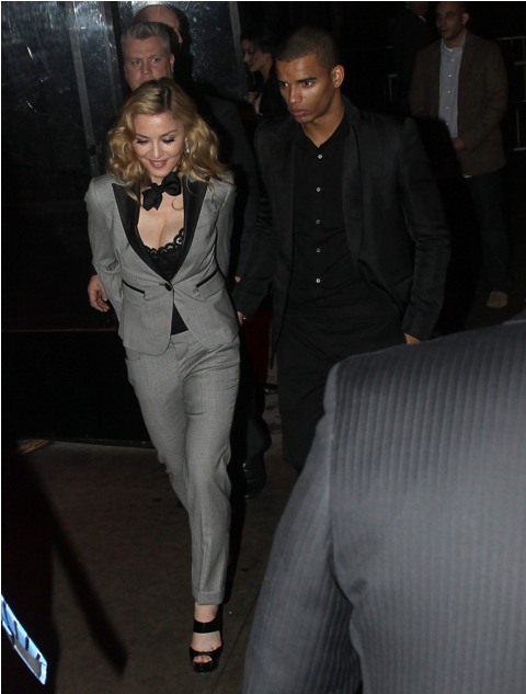 Later on, at the afterparty, holding hands with her man Brahim, she changed into a beautifully cut pantsuit without wiping the smugness off her face. It'll be a while before I stop thinking of "Playboyus Maximus" whenever I see her. Maybe the Super Bowl will change this. Maybe at the Super Bowl Madonna won't be the woman who tells bad jokes, clawing to keep a coolness that seems to have abandoned her, in search of someone less desperate.