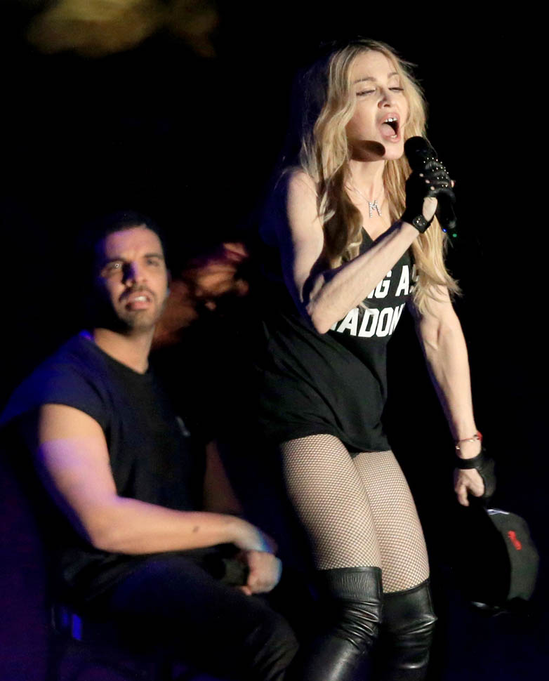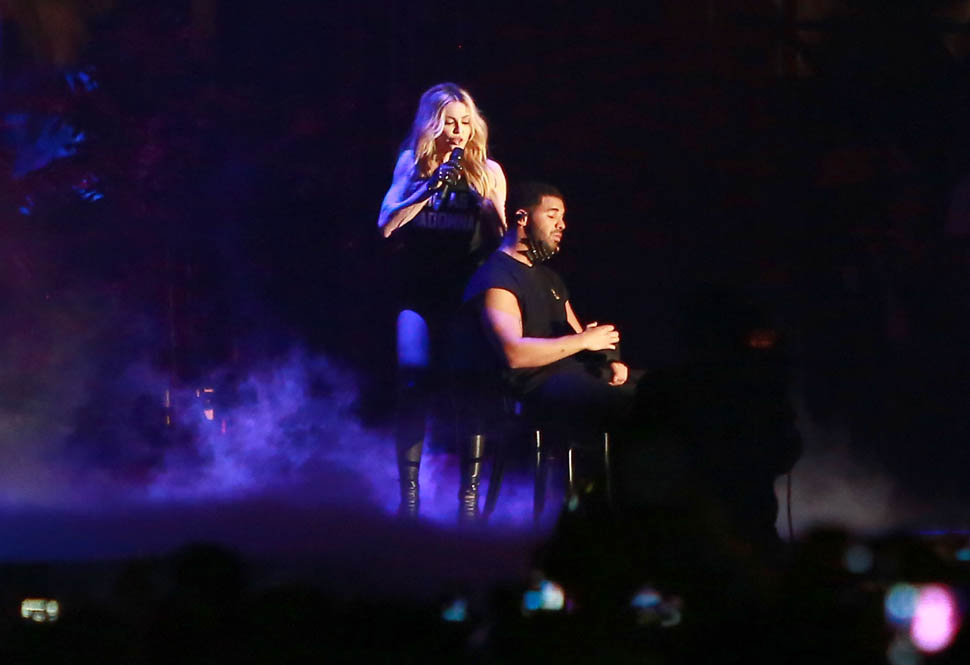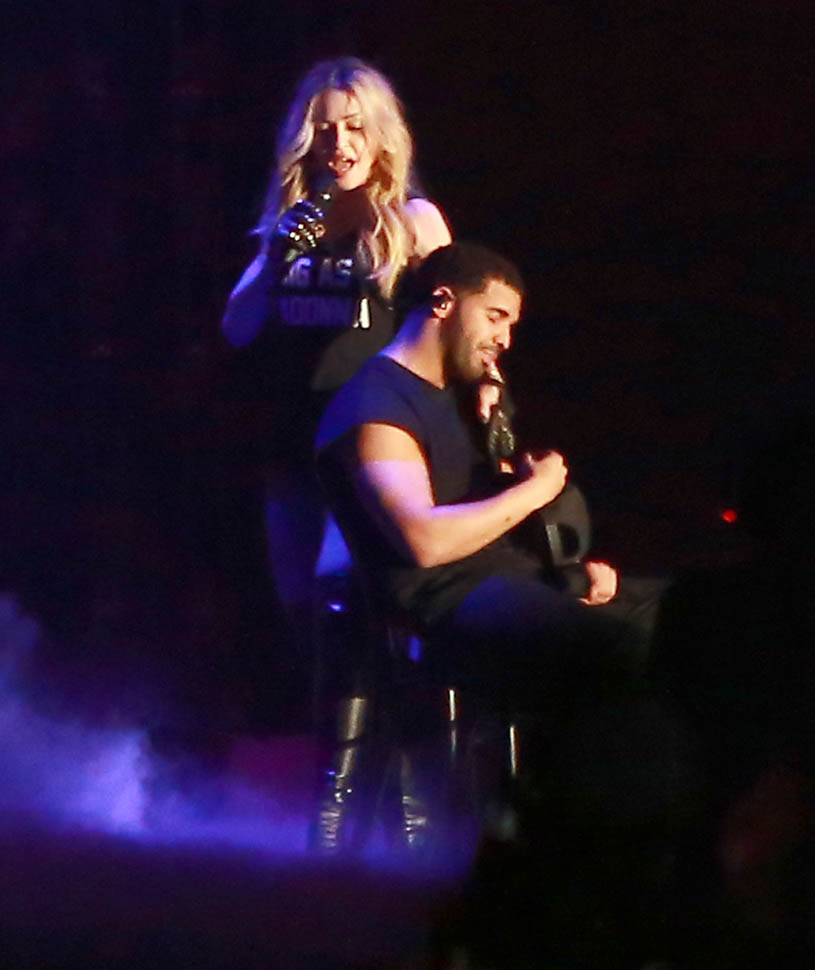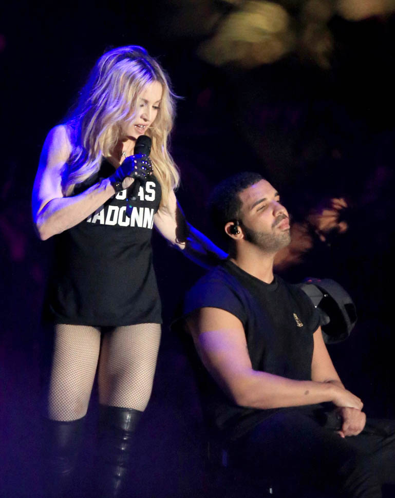 Madonna joined Drake on stage at Coachella this weekend. At one point, while he was sitting in a chair, she approached him from behind and put her tongue in his mouth. This seems to happen to him a lot. When he’s in a chair. Like with Nicki Minaj in the Anaconda video.